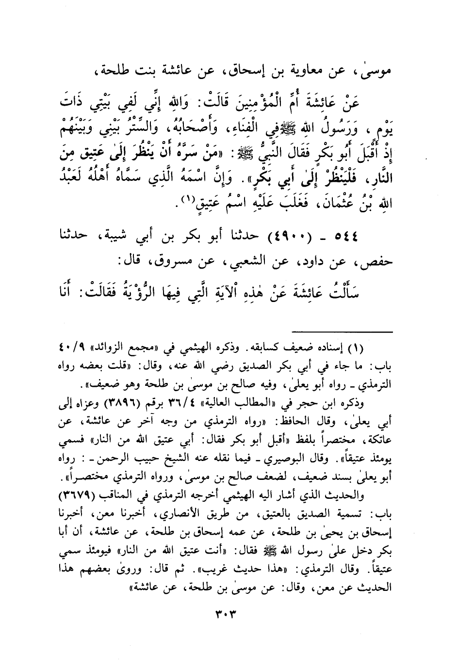 4900 - حَدَّثَنَا أَبُو بَكْرِ بْنُ أَبِي شَيْبَةَ، حَدَّثَنَا حَفْصٌ، عَنْ دَاوُدَ، عَنِ الشَّعْبِيِّ، عَنْ مَسْرُوقٍ قَالَ: سَأَلْتُ عَائِشَةَ عَنِ هَذِهِ الْآيَةِ الَّتِي فِيهَا الرُّؤْيَةُ، فَقَالَتْ: أَنَا -[304]- أَعْلَمُ هَذِهِ الْأُمَّةِ بِهَذِهِ، وَأَنَا سَأَلْتُ رَسُولَ اللَّهِ صَلَّى اللهُ عَلَيْهِ وَسَلَّمَ عَنْ ذَلِكَ. قَالَ: «رَأَيْتُ جِبْرِيلَ». ثُمَّ قَالَتْ: «§مَنْ زَعَمَ أَنَّ مُحَمَّدًا رَأَى رَبَّهُ فَقَدْ أَعْظَمَ الْكَذِبَ عَلَى اللَّهِ» Kإسناده صحيح