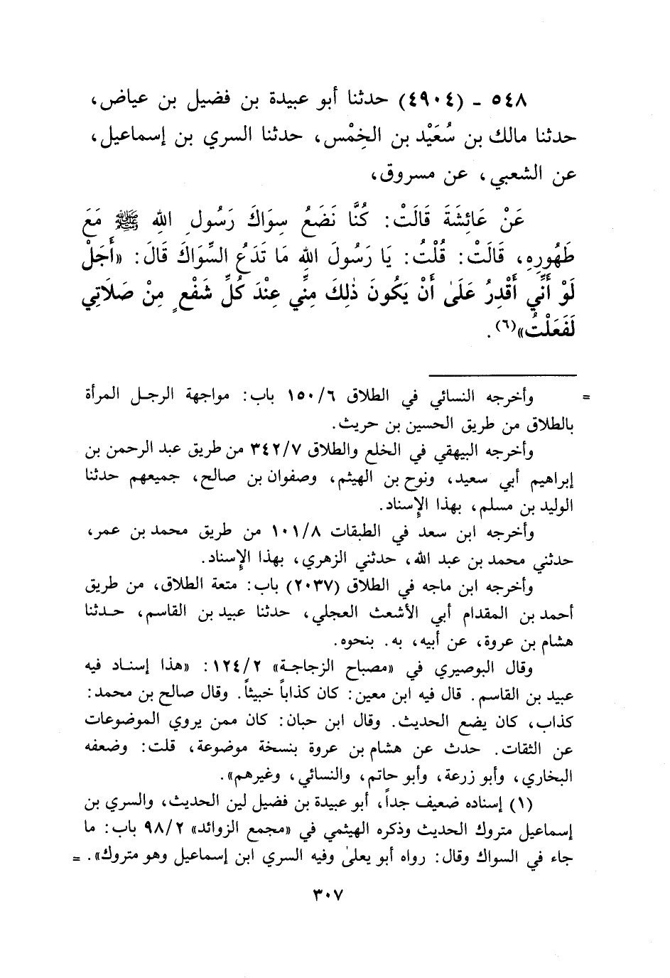 4904 - حَدَّثَنَا أَبُو عُبَيْدَةَ بْنُ فُضَيْلِ بْنِ عِيَاضٍ، حَدَّثَنَا مَالِكُ بْنُ سُعَيْرِ بْنِ الْخَمِيسِ، حَدَّثَنَا السَّرِيُّ بْنُ إِسْمَاعِيلَ، عَنِ الشَّعْبِيِّ، عَنْ مَسْرُوقٍ، عَنْ عَائِشَةَ قَالَتْ: كُنَّا " §نَضَعُ سِوَاكَ رَسُولِ اللَّهِ صَلَّى اللهُ عَلَيْهِ وَسَلَّمَ مَعَ طُهُورِهِ. قَالَتْ: قُلْتُ: يَا رَسُولَ اللَّهِ مَا تَدَعُ السِّوَاكَ. قَالَ: «أَجَلْ لَوْ أَنِّي أَقْدِرُ عَلَى أَنْ يَكُونَ ذَلِكَ مِنِّي عِنْدَ كُلِّ شَفْعٍ مِنْ صَلَاتِي لَفَعَلْتُ» Kإسناده ضعيف جدا