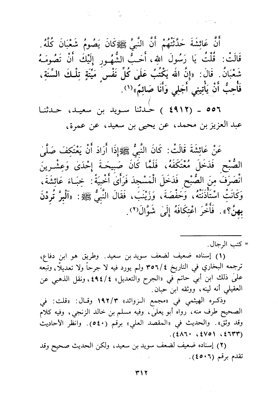 4912 - حَدَّثَنَا سُوَيْدُ بْنُ سَعِيدٍ، حَدَّثَنَا عَبْدُ الْعَزِيزِ بْنُ مُحَمَّدٍ، عَنْ يَحْيَى بْنِ سَعِيدٍ، عَنْ عَمْرَةَ، عَنْ عَائِشَةَ قَالَتْ: كَانَ النَّبِيُّ صَلَّى اللهُ عَلَيْهِ وَسَلَّمَ " §إِذَا أَرَادَ أَنْ يَعْتَكِفَ صَلَّى الصُّبْحَ فَدَخَلَ مُعْتَكَفَهُ، فَلَمَّا كَانَ صَبِيحَةَ إِحْدَى وَعِشْرِينَ انْصَرَفَ مِنَ الصُّبْحِ فَدَخَلَ الْمَسْجِدَ فَرَأَى أَخْبِيَةً: خِبَاءَ عَائِشَةَ وَكَانَتِ اسْتَأْذَنَتْهُ وَحَفْصَةَ وَزَيْنَبَ، فَقَالَ النَّبِيُّ صَلَّى اللهُ عَلَيْهِ وَسَلَّمَ: «آلْبِرَّ تُرِدْنَ بِهِنَّ؟» فَأَخَّرَ اعْتِكَافَهُ إِلَى شَوَّالٍ "Kإسناده ضعيف