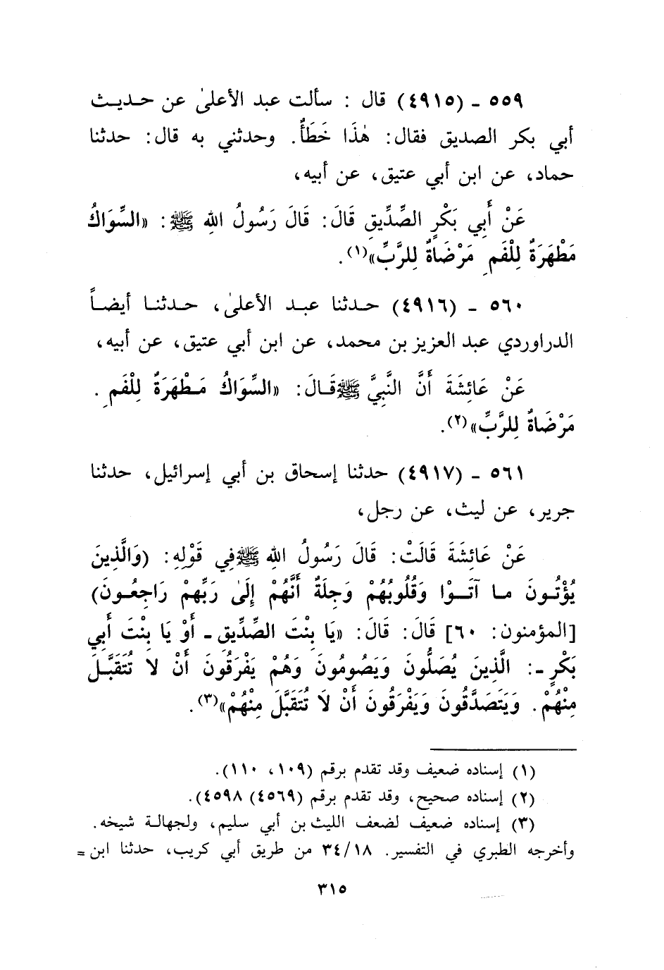 4915 - قَالَ: سَأَلْتُ عَبْدَ الْأَعْلَى عَنْ حَدِيثِ أَبِي بَكْرٍ الصِّدِّيقِ فَقَالَ: هَذَا خَطَأٌ، وَحَدَّثَنِي بِهِ قَالَ: حَدَّثَنَا حَمَّادٌ، عَنِ ابْنِ أَبِي عَتِيقٍ، عَنْ أَبِيهِ، عَنْ أَبِي بَكْرٍ الصِّدِّيقِ قَالَ: قَالَ رَسُولُ اللَّهِ صَلَّى اللهُ عَلَيْهِ وَسَلَّمَ: «§السِّوَاكُ مَطْهَرَةٌ لِلْفَمِ مَرْضَاةٌ لِلرَّبِّ» Kإسناده ضعيف
