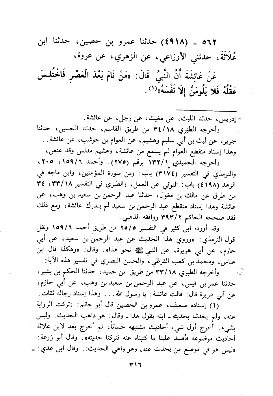 4918 - حَدَّثَنَا عَمْرُو بْنُ حَصِينٍ، حَدَّثَنَا ابْنُ عُلَاثَةَ، حَدَّثَنِي الْأَوْزَاعِيُّ، عَنِ الزُّهْرِيِّ، عَنْ عُرْوَةَ، عَنْ عَائِشَةَ، أَنَّ النَّبِيَّ صَلَّى اللهُ عَلَيْهِ وَسَلَّمَ قَالَ: «§مَنْ نَامَ بَعْدَ الْعَصْرِ فَاخْتُلِسَ عَقْلُهُ فَلَا يَلُومَنَّ إِلَّا نَفْسَهُ» Kإسناده ضعيف