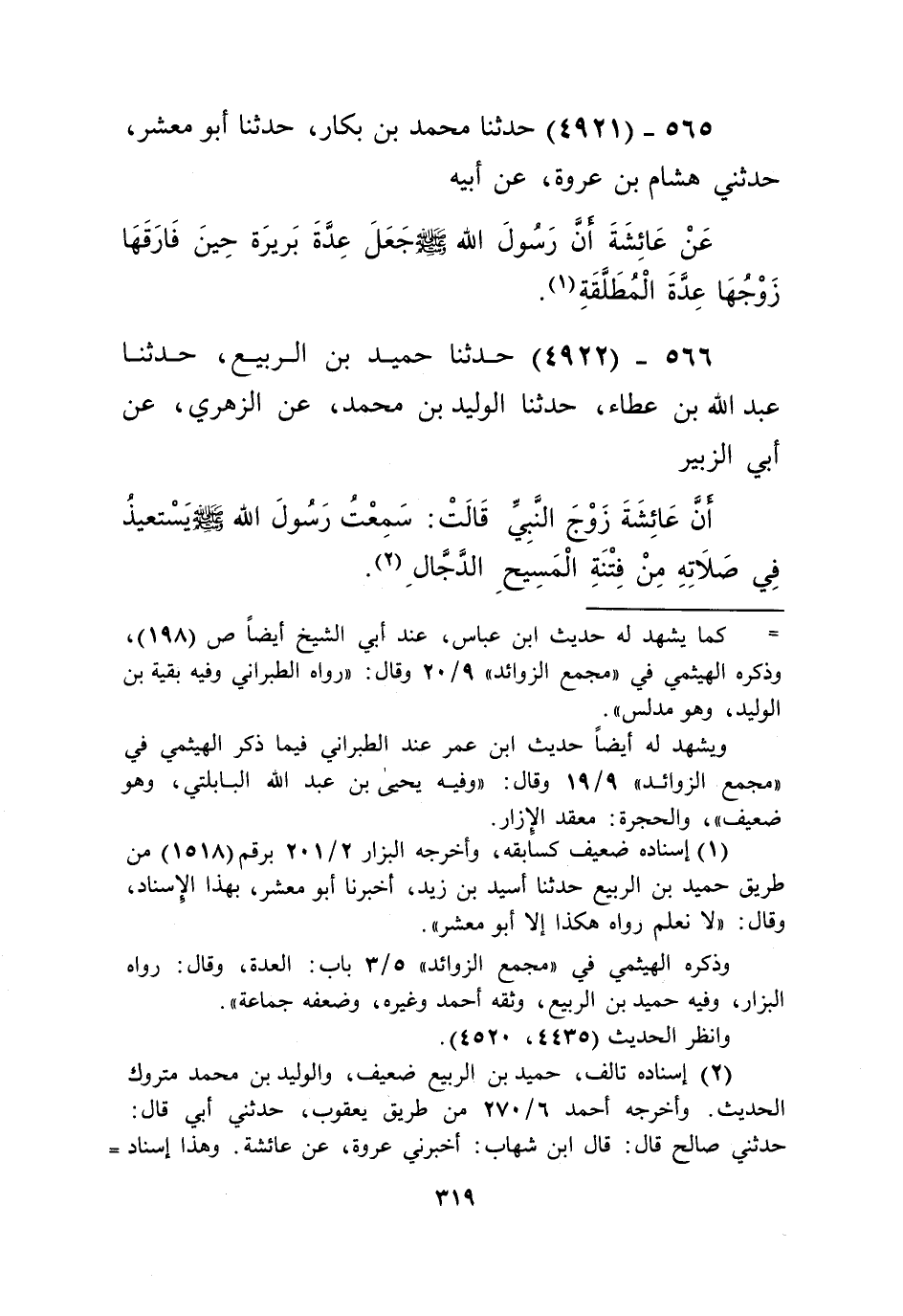 4922 - حَدَّثَنَا حُمَيْدُ بْنُ الرَّبِيعِ، حَدَّثَنَا عَبْدُ اللَّهِ بْنُ عَطَاءٍ، حَدَّثَنَا الْوَلِيدُ بْنُ مُحَمَّدٍ، عَنِ الزُّهْرِيِّ، عَنْ أَبِي الزُّبَيْرِ، أَنَّ عَائِشَةَ زَوْجَ النَّبِيِّ صَلَّى اللهُ عَلَيْهِ وَسَلَّمَ قَالَتْ: سَمِعْتُ رَسُولَ اللَّهِ صَلَّى اللهُ عَلَيْهِ وَسَلَّمَ «§يَسْتَعِيذُ فِي صَلَاتِهِ مِنْ فِتْنَةِ الْمَسِيحِ الدَّجَّالِ» Kإسناده تالف