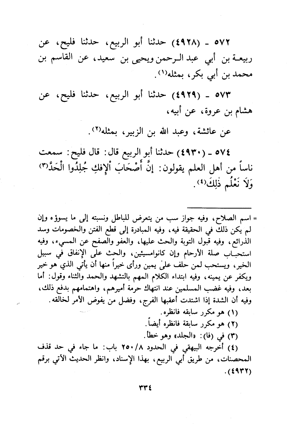 4930 - حَدَّثَنَا أَبُو الرَّبِيعِ قَالَ: قَالَ فُلَيْحٌ: سَمِعْتُ نَاسًا مِنْ أَهْلِ الْعِلْمِ يَقُولُونَ: إِنَّ «§أَصْحَابَ الْإِفْكِ جُلِدُوا الْحَدَّ، وَلَا نَعْلَمُ ذَلِكَ»