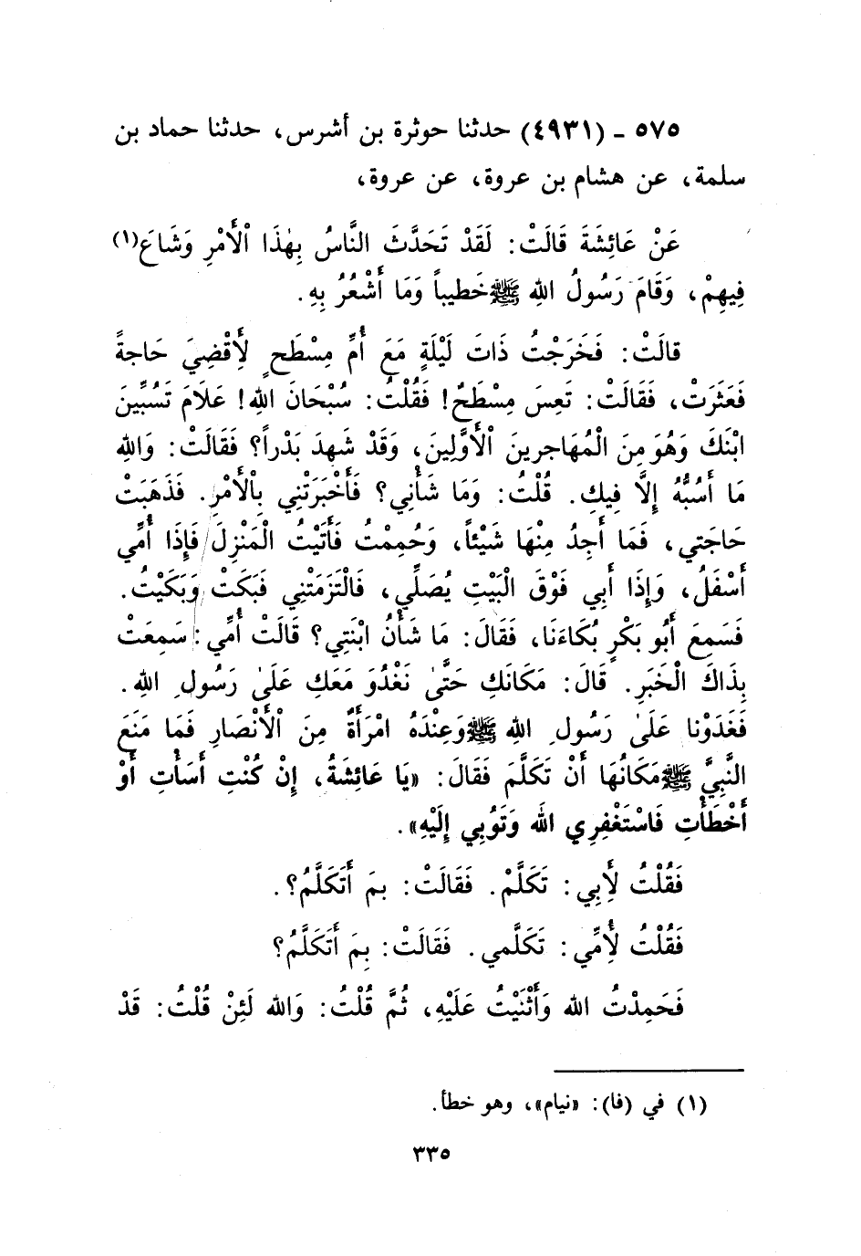 4931 - حَدَّثَنَا حَوْثَرَةُ بْنُ أَشْرَسَ، حَدَّثَنَا حَمَّادُ بْنُ سَلَمَةَ، عَنْ هِشَامِ بْنِ عُرْوَةَ، عَنْ عُرْوَةَ، عَنْ عَائِشَةَ قَالَتْ: لَقَدْ تَحَدَّثَ النَّاسُ بِهَذَا الْأَمْرِ وَشَاعَ فِيهِمْ، وَقَامَ رَسُولُ اللَّهِ صَلَّى اللهُ عَلَيْهِ وَسَلَّمَ خَطِيبًا وَمَا أَشْعُرُ بِهِ. قَالَتْ: §فَخَرَجْتُ ذَاتَ لَيْلَةٍ مَعَ أُمِّ مِسْطَحٍ لِأَقْضِيَ حَاجَةً، فَعَثَرَتْ فَقَالَتْ: تَعِسَ مِسْطَحٌ فَقُلْتُ: سُبْحَانَ اللَّهِ عَلَامَ تَسُبِّينَ ابْنَكِ وَهُوَ مِنَ الْمُهَاجِرِينَ الْأَوَّلِينَ، وَقَدْ شَهِدَ بَدْرًا؟ فَقَالَتْ: وَاللَّهِ مَا أَسُبُّهُ إِلَّا فِيكِ. قُلْتُ: وَمَا شَأْنِي؟ فَأَخْبَرَتْنِي بِالْأَمْرِ، فَذَهَبَتْ حَاجَتِي فَمَا أَجِدُ مِنْهَا شَيْئًا، وَحُمِمْتُ فَأَتَيْتُ الْمَنْزِلَ، فَإِذَا أُمِّي أَسْفَلُ وَإِذَا أَبِي فَوْقَ الْبَيْتِ يُصَلِّي، فَالْتَزَمَتْنِي فَبَكَتْ وَبَكَيْتُ، فَسَمِعَ أَبُو بَكْرٍ بُكَاءَنَا فَقَالَ: مَا شَأْنُ ابْنَتِي؟ قَالَتْ أُمِّي: سَمِعَتْ بِذَاكَ الْخَبَرِ. قَالَ: مَكَانَكِ حَتَّى نَغْدُو مَعَكِ عَلَى رَسُولِ اللَّهِ صَلَّى اللهُ عَلَيْهِ وَسَلَّمَ، فَغَدَوْنَا عَلَى رَسُولِ اللَّهِ صَلَّى اللهُ عَلَيْهِ وَسَلَّمَ وَعِنْدَهُ امْرَأَةٌ مِنَ الْأَنْصَارِ، فَمَا مَنَعَ النَّبِيَّ صَلَّى اللهُ عَلَيْهِ وَسَلَّمَ مَكَانُهَا أَنْ تَكَلَّمَ فَقَالَ: «يَا عَائِشَةُ إِنْ كُنْتِ أَسَأْتِ أَوْ أَخْطَأْتِ فَاسْتَغْفِرِي اللَّهَ وَتُوبِي إِلَيْهِ». فَقُلْتُ لِأَبِي: تَكَلَّمْ. فَقَالَ: بِمَ أَتَكَلَّمُ؟ فَقُلْتُ لِأُمِّي: تَكَلَّمِي. فَقَالَتْ: بِمَ أَتَكَلَّمُ؟ فَحَمِدْتُ اللَّهَ وَأَثْنَيْتُ عَلَيْهِ ثُمَّ قُلْتُ: وَاللَّهِ لَئِنْ قُلْتُ: قَدْ -[336]- فَعَلْتُ - وَاللَّهُ يَعْلَمُ مَا فَعَلْتُ - لَتَقُولُنَّ: قَدْ أَقَرَّتْ، وَلَئِنْ قُلْتُ: مَا فَعَلْتُ - وَاللَّهُ يَعْلَمُ مَا فَعَلْتُ - لَتَقُولُنَّ: كَذَبَتْ، فَمَا أَجِدُ لِي وَلَكُمْ مَثَلًا إِلَّا مَا قَالَ الْعَبْدُ الصَّالِحُ - فَنَسِيتُ اسْمَهُ فَقُلْتُ: أَبُو يُوسُفَ -: {صَبْرٌ جَمِيلٌ وَاللَّهُ الْمُسْتَعَانُ عَلَى مَا تَصِفُونَ}. فَدَخَلَ رَسُولُ اللَّهِ صَلَّى اللهُ عَلَيْهِ وَسَلَّمَ عَلَى جَارِيَةٍ نُوبِيَّةٍ فَقَالَ: «يَا فُلَانَةُ، مَاذَا تَعْلَمِينَ مِنْ عَائِشَةَ؟» فَقَالَتْ: وَاللَّهِ مَا أَعْلَمُ عَلَى عَائِشَةَ عَيْبًا إِلَّا أَنَّهَا تَنَامُ وَتَدْخُلُ الدَّاجِنُ فَتَأْكُلُ خَمِيرَهَا وَحَصِيرَهَا، فَلَمَّا فَطِنَتْ لِمَا يُرِيدُ قَالَتْ: وَاللَّهِ مَا أَعْلَمُ مِنْ عَائِشَةَ إِلَّا مَا يَعْلَمُ الصَّائِغُ مِنَ التِّبْرِ الْأَحْمَرِ. فَصَعِدَ رَسُولُ اللَّهِ صَلَّى اللهُ عَلَيْهِ وَسَلَّمَ الْمِنْبَرَ فَقَالَ: «أَشِيرُوا عَلَيَّ يَا مَعْشَرَ الْمُسْلِمِينَ فِي قَوْمٍ أَبَنُوا أَهْلِي، وَايْمُ اللَّهِ مَا عَلِمْتُ عَلَى أَهْلِي سُوءًا قَطُّ وَأَبَنُوهُمْ بِمَنْ؟ وَاللَّهِ مَا عَلِمْتُ عَلَيْهِ مِنْ سُوءٍ قَطُّ، وَمَا دَخَلَ بَيْتِي إِلَّا وَأَنَا شَاهِدٌ، وَلَا سَافَرْتُ إِلَّا وَهُوَ مَعِي». فَقَالَ سَعْدُ بْنُ مُعَاذٍ: أَرَى يَا رَسُولَ اللَّهِ أَنْ تَضْرِبَ أَعْنَاقَهُمْ، فَقَامَ رِجَالٌ مِنَ الْخَزْرَجِ فَقَالُوا: وَاللَّهِ لَوْ كَانُوا مِنْ رَهْطِكَ الْأَوْسِ مَا أَمَرْتَ بِضَرْبِ أَعْنَاقِهِمْ، حَتَّى كَادَ أَنْ يَكُونَ بَيْنَ الْأَوْسِ وَالْخَزْرَجِ كَوْنٌ، وَنَزَلَ الْوَحْيُ عَلَى رَسُولِ اللَّهِ صَلَّى اللهُ عَلَيْهِ وَسَلَّمَ. قَالَتْ عَائِشَةُ: فَمَا سُرِّيَ عَنْهُ حَتَّى رَأَيْتُ السُّرُورَ بَيْنَ عَيْنَيْهِ -[337]-. فَقَالَ: «أَبْشِرِي يَا عَائِشَةُ فَقَدْ أَنْزَلَ اللَّهُ عُذْرَكِ» فَقَالَ أَبَوَايَ: قَوْمِي فَقَبِّلِي رَأْسَ رَسُولِ اللَّه