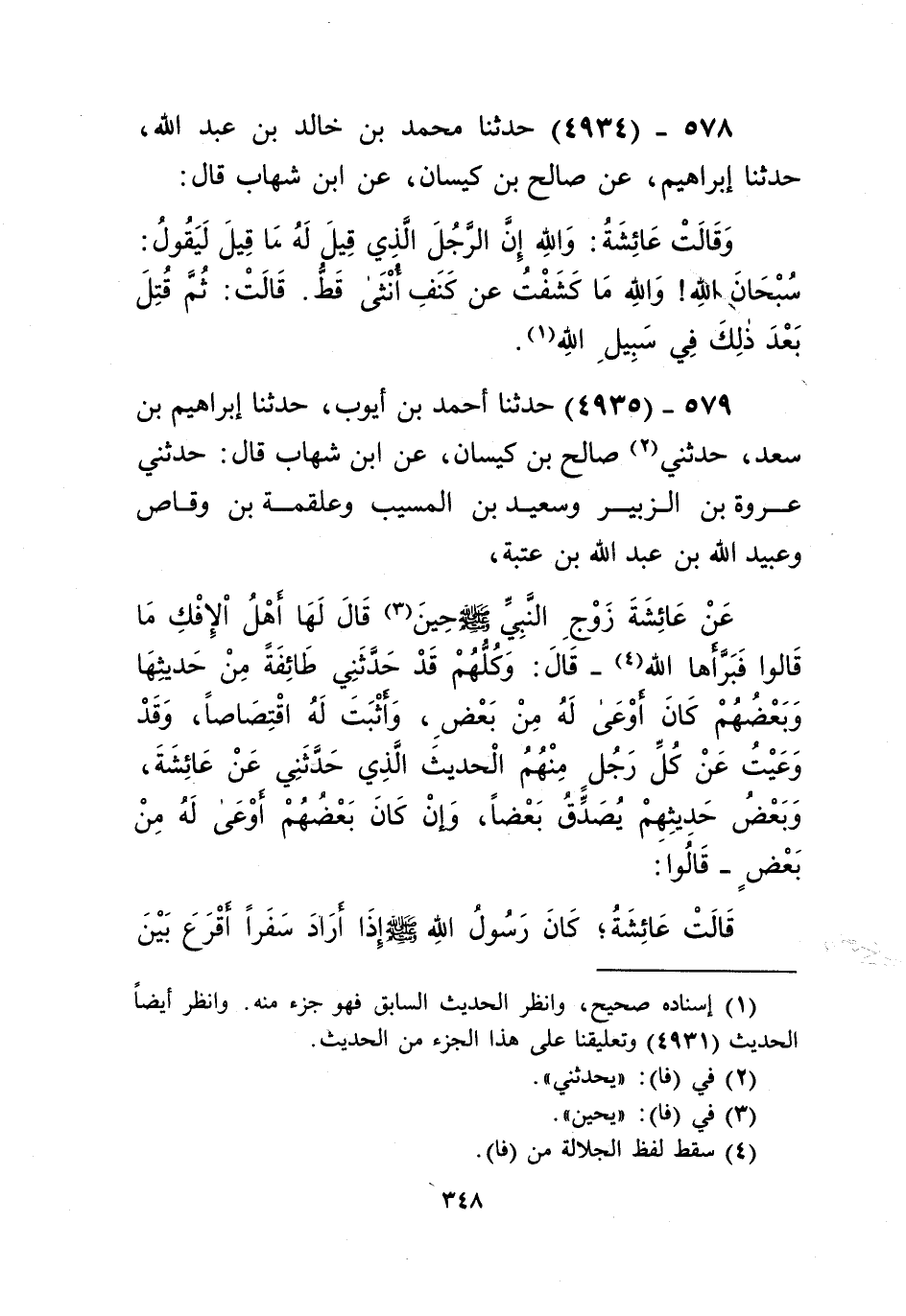 4934 - حَدَّثَنَا مُحَمَّدُ بْنُ خَالِدِ بْنِ عَبْدِ اللَّهِ، حَدَّثَنَا إِبْرَاهِيمُ، عَنْ صَالِحِ بْنِ كَيْسَانَ، عَنِ ابْنِ شِهَابٍ قَالَ: وَقَالَتْ عَائِشَةُ: " §وَاللَّهِ إِنَّ الرَّجُلَ الَّذِي قِيلَ لَهُ مَا قِيلَ لَيَقُولُ: سُبْحَانَ اللَّهِ وَاللَّهِ مَا كَشَفْتُ عَنْ كَنَفِ أُنْثَى قَطُّ. قَالَتْ: ثُمَّ قُتِلَ بَعْدَ ذَلِكَ فِي سَبِيلِ اللَّهِ "Kإسناده صحيح