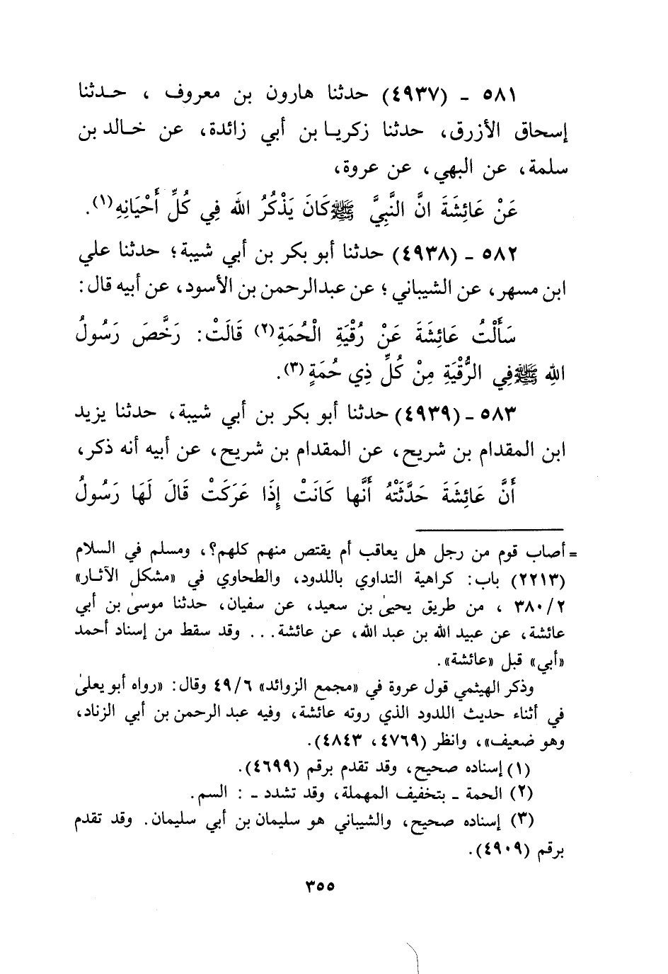 4938 - حَدَّثَنَا أَبُو بَكْرِ بْنُ شَيْبَةَ، حَدَّثَنَا عَلِيُّ بْنُ مُسْهِرٍ،، عَنِ الشَّيْبَانِيِّ، عَنْ عَبْدِ الرَّحْمَنِ بْنِ الْأَسْوَدِ، عَنْ أَبِيهِ قَالَ: سَأَلْتُ عَائِشَةَ عَنْ رُقْيَةِ الْحُمَةِ قَالَتْ: «§رَخَّصَ رَسُولُ اللَّهِ صَلَّى اللهُ عَلَيْهِ وَسَلَّمَ فِي الرُّقْيَةِ مِنْ كُلِّ ذِي حُمَةٍ» Kإسناده صحيح