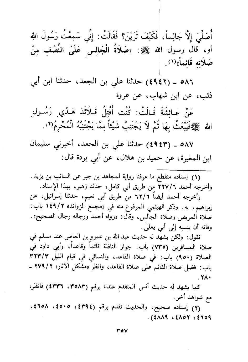 4942 - حَدَّثَنَا عَلِيُّ بْنُ الْجَعْدِ، حَدَّثَنَا ابْنُ أَبِي ذِئْبٍ، عَنِ ابْنِ شِهَابٍ، عَنْ عُرْوَةَ، عَنْ عَائِشَةَ قَالَتْ: «§كُنْتُ أَفْتِلُ قَلَائِدَ هَدْيِ رَسُولِ اللَّهِ صَلَّى اللهُ عَلَيْهِ وَسَلَّمَ، فَيَبْعَثُ بِهَا ثُمَّ لَا يَجْتَنِبُ شَيْئًا مِمَّا يَجْتَنِبُهُ الْمُحْرِمُ» Kإسناده صحيح