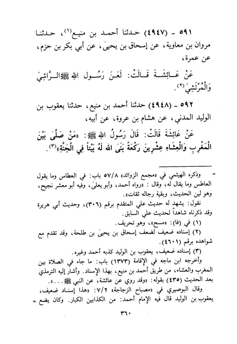 4947 - حَدَّثَنَا أَحْمَدُ بْنُ مَنِيعٍ، حَدَّثَنَا مَرْوَانُ بْنُ مُعَاوِيَةَ، عَنْ إِسْحَاقَ بْنِ يَحْيَى، عَنْ أَبِي بَكْرِ بْنِ حَزْمٍ، عَنْ عَمْرَةَ، عَنْ عَائِشَةَ قَالَتْ: «§لَعَنَ رَسُولُ اللَّهِ صَلَّى اللهُ عَلَيْهِ وَسَلَّمَ الرَّاشِيَ وَالْمُرْتَشِيَ» Kإسناده ضعيف