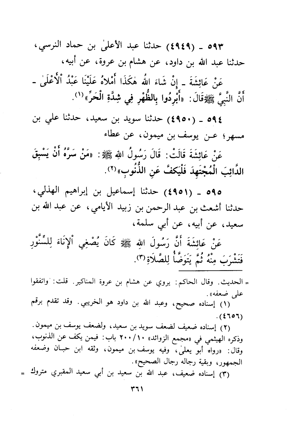4949 - حَدَّثَنَا عَبْدُ الْأَعْلَى بْنُ حَمَّادٍ النَّرْسِيُّ، حَدَّثَنَا عَبْدُ اللَّهِ بْنُ دَاوُدَ، عَنْ هِشَامِ بْنِ عُرْوَةَ، عَنْ أَبِيهِ، عَنْ عَائِشَةَ - إِنْ شَاءَ اللَّهُ هَكَذَا أَمْلَاهُ عَلَيْنَا عَبْدُ الْأَعْلَى - أَنَّ النَّبِيَّ صَلَّى اللهُ عَلَيْهِ وَسَلَّمَ قَالَ: «§أَبْرِدُوا بِالظُّهْرِ فِي شِدَّةِ الْحَرِّ» Kإسناده صحيح