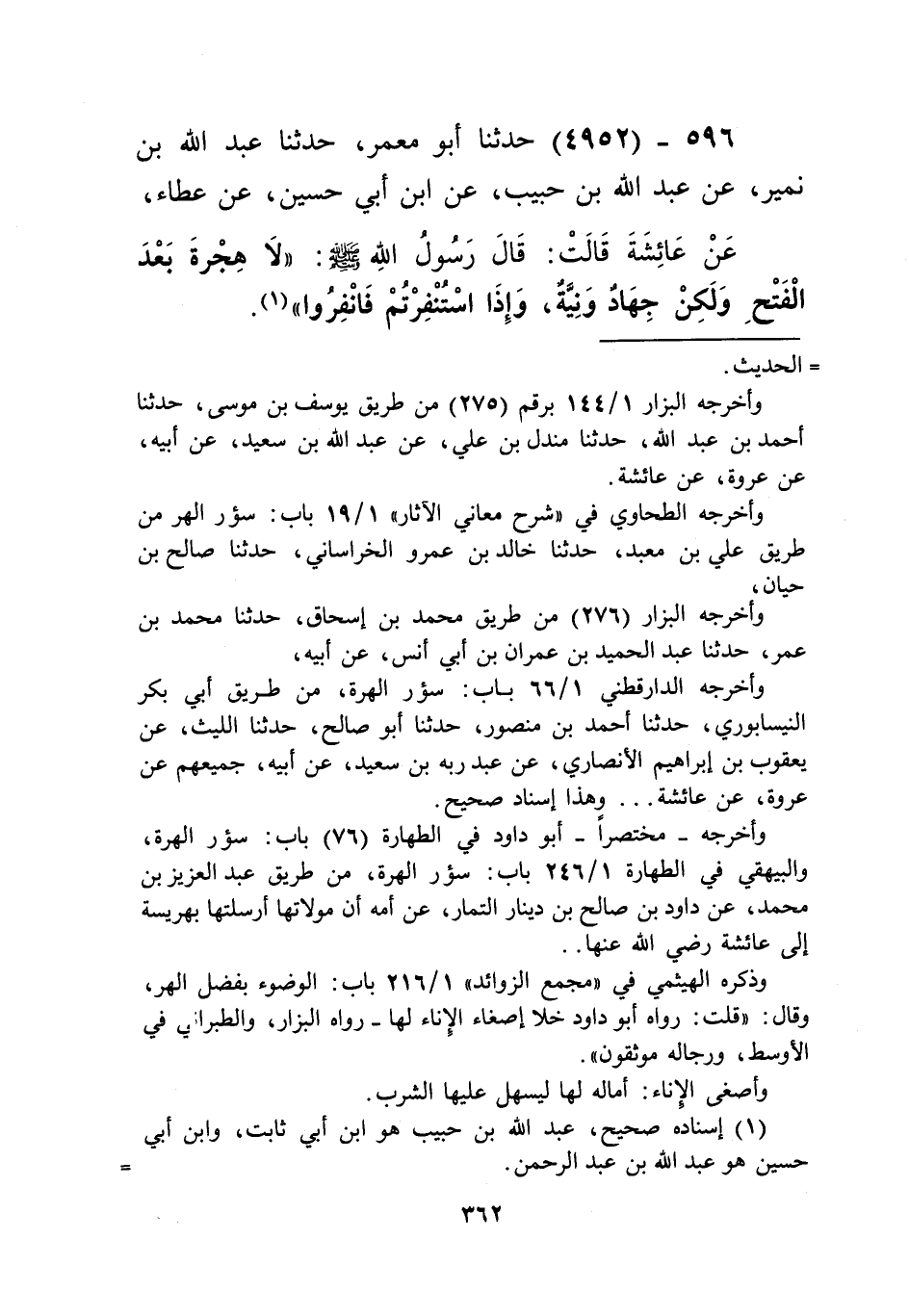 4952 - حَدَّثَنَا أَبُو مَعْمَرٍ، حَدَّثَنَا عَبْدُ اللَّهِ بْنُ نُمَيْرٍ، عَنْ عَبْدِ اللَّهِ بْنِ حَبِيبٍ، عَنِ ابْنِ أَبِي حُسَيْنٍ، عَنْ عَطَاءٍ، عَنْ عَائِشَةَ قَالَتْ: قَالَ رَسُولُ اللَّهِ صَلَّى اللهُ عَلَيْهِ وَسَلَّمَ: «§لَا هِجْرَةَ بَعْدَ الْفَتْحِ وَلَكِنْ جِهَادٌ وَنِيَّةٌ، وَإِذَا اسْتُنْفِرْتُمْ فَانْفِرُوا» Kإسناده صحيح