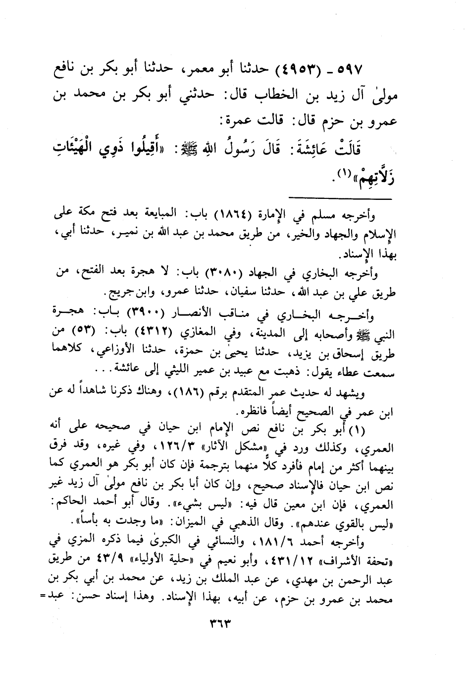 4953 - حَدَّثَنَا أَبُو مَعْمَرٍ، حَدَّثَنَا أَبُو بَكْرِ بْنُ نَافِعٍ، مَوْلَى آلِ زَيْدِ بْنِ الْخَطَّابِ قَالَ: حَدَّثَنِي أَبُو بَكْرِ بْنُ مُحَمَّدِ بْنِ عَمْرِو بْنِ حَزْمٍ، قَالَ: قَالَتْ عَمْرَةُ: قَالَتْ عَائِشَةُ: قَالَ رَسُولُ اللَّهِ صَلَّى اللهُ عَلَيْهِ وَسَلَّمَ: «§أَقِيلُوا ذَوِي الْهَيْئَاتِ زَلَّاتِهِمْ» -[364]- قَالَ: فَحَضَرْتُ أَبَا بَكْرِ بْنَ عَمْرِو بْنِ حَزْمٍ قَضَى بِذَلِكَ