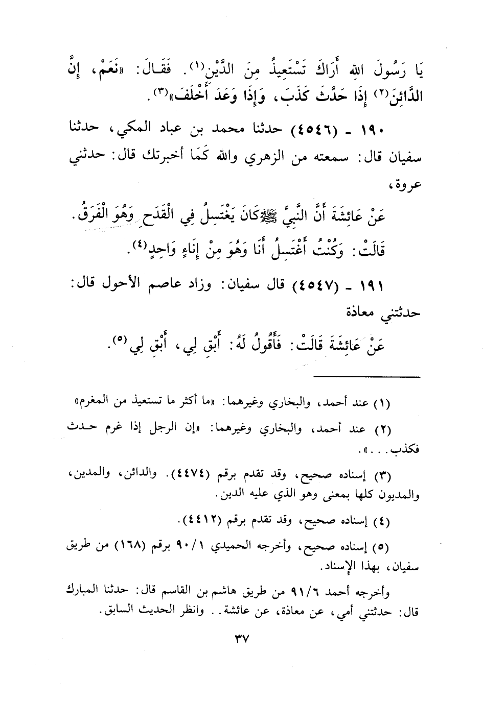 4546 - حَدَّثَنَا مُحَمَّدُ بْنُ عَبَّادٍ الْمَكِّيُّ، حَدَّثَنَا سُفْيَانُ قَالَ: سَمِعْتُهُ مِنَ الزُّهْرِيِّ - وَاللَّهِ كَمَا أَخْبَرْتُكَ - قَالَ: حَدَّثَنِي عُرْوَةُ، عَنْ عَائِشَةَ، أَنَّ النَّبِيَّ صَلَّى اللهُ عَلَيْهِ وَسَلَّمَ " §كَانَ يَغْتَسِلُ فِي الْقَدَحِ - وَهُوَ الْفَرَقُ -. قَالَتْ: وَكُنْتُ أَغْتَسِلُ أَنَا وَهُوَ مِنْ إِنَاءٍ وَاحِدٍ "Kإسناده صحيح