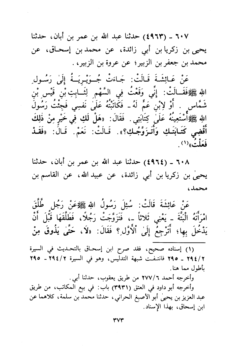 4963 - حَدَّثَنَا عَبْدُ اللَّهِ بْنُ عُمَرَ بْنِ أَبَانَ، حَدَّثَنَا يَحْيَى بْنُ زَكَرِيَّا بْنِ أَبِي زَائِدَةَ، عَنْ مُحَمَّدِ بْنِ إِسْحَاقَ، عَنْ مُحَمَّدِ بْنِ جَعْفَرِ بْنِ الزُّبَيْرِ، عَنْ عُرْوَةَ بْنِ الزُّبَيْرِ، عَنْ عَائِشَةَ قَالَتْ: " §جَاءَتْ جُوَيْرِيَةُ إِلَى رَسُولِ اللَّهِ صَلَّى اللهُ عَلَيْهِ وَسَلَّمَ فَقَالَتْ: إِنِّي وَقَعْتُ فِي السَّهْمِ لِثَابِتِ بْنِ قَيْسِ بْنِ شَمَّاسٍ - أَوْ لِابْنِ عَمٍّ لَهُ - فَكَاتَبْتُهُ عَلَى نَفْسِي، فَجِئْتُ رَسُولَ اللَّهِ صَلَّى اللهُ عَلَيْهِ وَسَلَّمَ أَسْتَعِينُهُ عَلَى كِتَابِي. فَقَالَ: «هَلْ لَكِ فِي خَيْرٍ مِنْ ذَلِكَ أَقْضِي كِتَابَكِ وَأَتَزَوَّجُكِ؟» قَالَتْ: نَعَمْ. قَالَ: «فَقَدْ فَعَلْتُ» Kإسناده صحيح