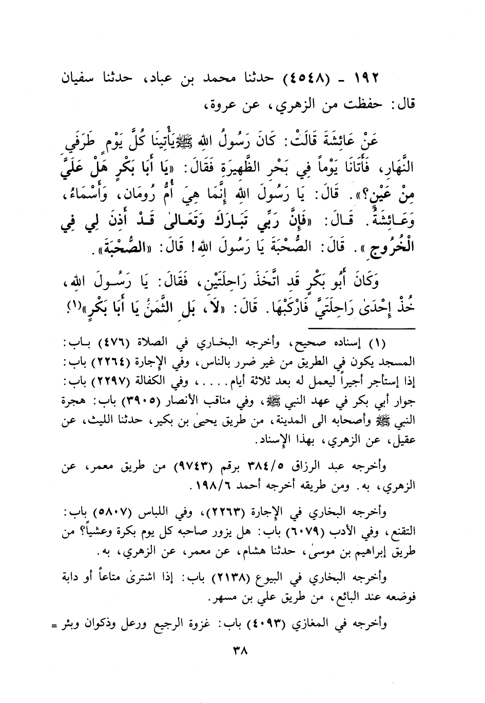 4548 - حَدَّثَنَا مُحَمَّدُ بْنُ عَبَّادٍ، حَدَّثَنَا سُفْيَانُ، قَالَ: حَفِظْتُ مِنَ الزُّهْرِيِّ، عَنْ عُرْوَةَ، عَنْ عَائِشَةَ قَالَتْ: كَانَ رَسُولُ اللَّهِ صَلَّى اللهُ عَلَيْهِ وَسَلَّمَ يَأْتِينَا كُلَّ يَوْمٍ طَرَفَيِ النَّهَارِ، فَأَتَانَا يَوْمًا فِي نَحْرِ ظَهِيرَةٍ فَقَالَ: يَا أَبَا بَكْرٍ هَلْ عَلَيَّ مِنْ عَيْنٍ؟ " قَالَ: يَا رَسُولَ اللَّهِ إِنَّمَا هِيَ أُمُّ رُومَانَ وَأَسْمَاءُ وَعَائِشَةُ. قَالَ: «§فَإِنَّ رَبِّي تَبَارَكَ وَتَعَالَى قَدْ أَذِنَ لِي فِي الْخُرُوجِ». قَالَ: الصُّحْبَةُ يَا رَسُولَ اللَّهِ. قَالَ: «الصُّحْبَةُ» وَكَانَ أَبُو بَكْرٍ قَدِ اتَّخَذَ رَاحِلَتَيْنِ، فَقَالَ: يَا رَسُولَ اللَّهِ خُذْ إِحْدَى رَاحِلَتَيَّ فَارْكَبْهَا. قَالَ: «لَا. بَلِ الثَّمَنُ يَا أَبَا بَكْرٍ» Kإسناده صحيح