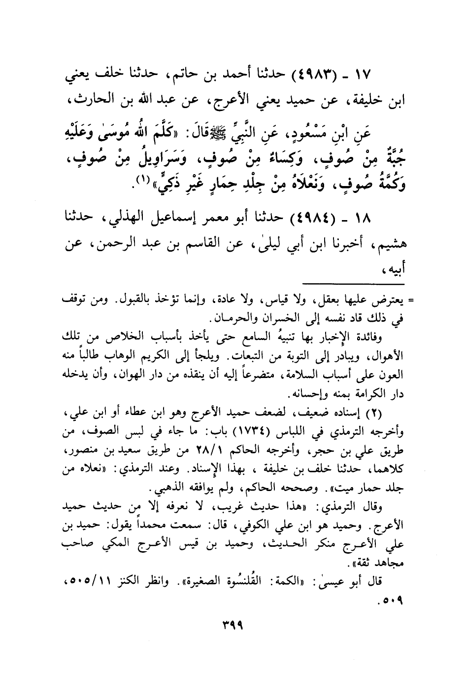 4983 - حَدَّثَنَا أَحْمَدُ بْنُ حَاتِمٍ، حَدَّثَنَا خَلَفُ يَعْنِي ابْنَ خَلِيفَةَ، عَنْ حُمَيْدٍ يَعْنِي الْأَعْرَجَ، عَنْ عَبْدِ اللَّهِ بْنِ الْحَارِثِ، عَنِ ابْنِ مَسْعُودٍ، عَنِ النَّبِيِّ صَلَّى اللهُ عَلَيْهِ وَسَلَّمَ قَالَ: «§كَلَّمَ اللَّهُ مُوسَى وَعَلَيْهِ جُبَّةٌ مِنْ صُوفٍ، وَكِسَاءٌ مِنْ صُوفٍ، وَسَرَاوِيلُ مِنْ صُوفٍ، وَكُمَّةُ صُوفٍ، وَنَعْلَاهُ مِنْ جِلْدِ حِمَارٍ غَيْرِ ذَكِيٍّ» Kإسناده ضعيف