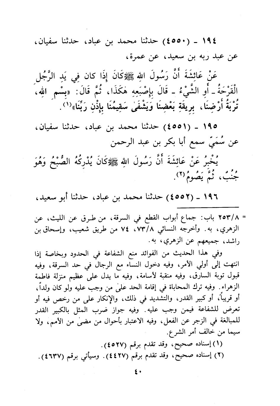 4550 - حَدَّثَنَا مُحَمَّدُ بْنُ عَبَّادٍ، حَدَّثَنَا سُفْيَانُ، عَنْ عَبْدِ رَبِّهِ بْنِ سَعِيدٍ، عَنْ عَمْرَةَ، عَنْ عَائِشَةَ، أَنَّ رَسُولَ اللَّهِ صَلَّى اللهُ عَلَيْهِ وَسَلَّمَ كَانَ " §إِذَا كَانَ فِي يَدِ الرَّجُلِ الْقُرْحَةُ - أَوِ الشَّيْءُ - قَالَ بِإِصْبَعِهِ هَكَذَا، ثُمَّ قَالَ: «بِسْمِ اللَّهِ. تُرْبَةُ أَرْضِنَا بِرِيقَةِ بَعْضِنَا وَيَشْفَى سَقِيمُنَا بِإِذْنِ رَبِّنَا» Kإسناده صحيح