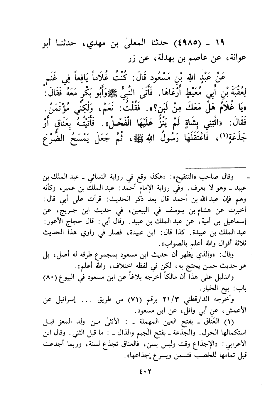 4985 - حَدَّثَنَا الْمُعَلَّى بْنُ مَهْدِيٍّ، حَدَّثَنَا أَبُو عَوَانَةَ، عَنْ عَاصِمِ بْنِ بَهْدَلَةَ، عَنْ زِرٍّ، عَنْ عَبْدِ اللَّهِ بْنِ مَسْعُودٍ قَالَ: كُنْتُ غُلَامًا يَافِعًا فِي غَنَمٍ لِعُقْبَةَ بْنِ أَبِي مُعَيْطٍ أَرْعَاهَا، فَأَتَى النَّبِيُّ صَلَّى اللهُ عَلَيْهِ وَسَلَّمَ وَأَبُو بَكْرٍ مَعَهُ فَقَالَ: «يَا غُلَامُ هَلْ مَعَكَ مِنْ لَبَنٍ؟» فَقُلْتُ: نَعَمْ. وَلَكِنِّي مُؤْتَمَنٌ. فَقَالَ: «§ائْتِنِي بِشَاةٍ لَمْ يَنْزُ عَلَيْهَا الْفَحْلُ». فَأَتَيْتُهُ بِعَنَاقٍ أَوْ جَذَعَةٍ، فَاعْتَقَلَهَا رَسُولُ اللَّهِ صَلَّى اللهُ عَلَيْهِ وَسَلَّمَ، ثُمَّ جَعَلَ يَمْسَحُ الضَّرْعَ -[403]- وَيَدْعُو حَتَّى أَنْزَلَتْ، فَأَتَاهُ أَبُو بَكْرٍ بِصَخْرَةٍ فَاحْتَلَبَ فِيهَا، ثُمَّ قَالَ لِأَبِي بَكْرٍ: «اشْرَبْ». " فَشَرِبَ أَبُو بَكْرٍ ثُمَّ شَرِبَ النَّبِيُّ صَلَّى اللهُ عَلَيْهِ وَسَلَّمَ بَعْدَهُ، ثُمَّ قَالَ لِلضَّرْعِ: «اقْلِصْ»، فَقَلَصَ فَعَادَ كَمَا كَانَ. قَالَ: ثُمَّ أَتَيْتُ النَّبِيَّ صَلَّى اللهُ عَلَيْهِ وَسَلَّمَ بَعْدُ فَقُلْتُ: يَا رَسُولَ اللَّهِ عَلِّمْنِي مِنْ هَذَا الْكَلَامِ - أَوْ مِنْ هَذَا الْقُرْآنِ - فَمَسَحَ رَأْسِي وَقَالَ: «إِنَّكَ غُلَامٌ مُعَلَّمٌ». قَالَ: فَلَقَدْ أَخَذْتُ مِنْ فِيهِ سَبْعِينَ سُورَةً مَا نَازَعَنِي فِيهَا بِشْرٌ "Kإسناده حسن
