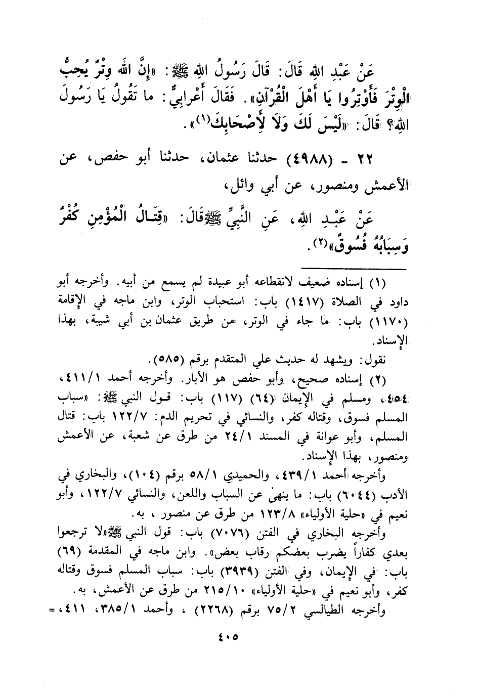 4988 - حَدَّثَنَا عُثْمَانُ، حَدَّثَنَا أَبُو حَفْصٍ، عَنِ الْأَعْمَشِ، وَمَنْصُورٍ، عَنْ أَبِي وَائِلٍ، عَنْ عَبْدِ اللَّهِ، عَنِ النَّبِيِّ صَلَّى اللهُ عَلَيْهِ وَسَلَّمَ قَالَ: «§قِتَالُ الْمُؤْمِنِ كُفْرٌ، وَسِبَابُهُ فُسُوقٌ» Kإسناده صحيح