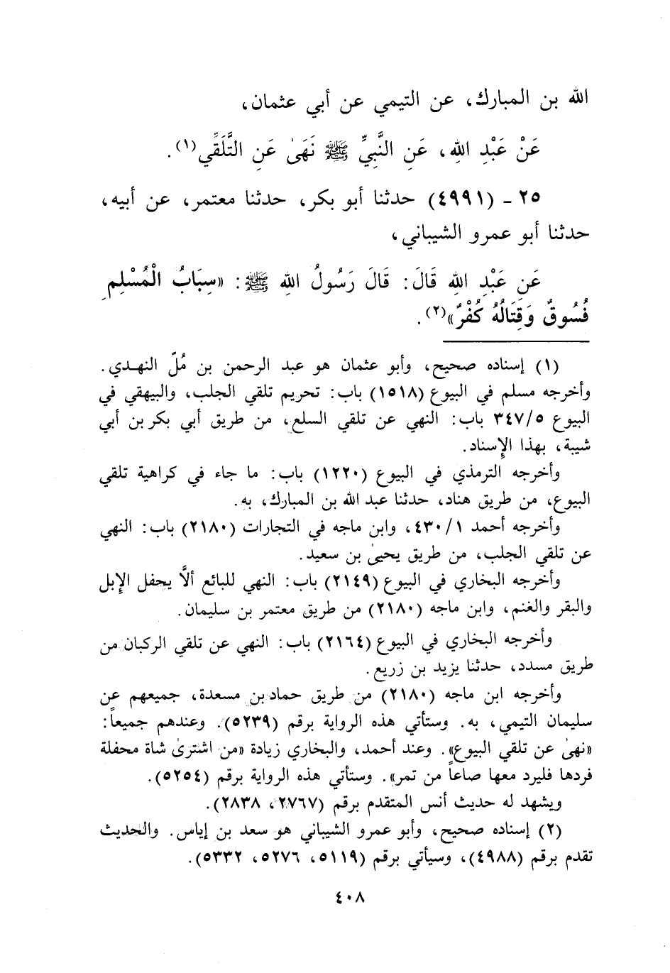 4991 - حَدَّثَنَا أَبُو بَكْرٍ، حَدَّثَنَا مُعْتَمِرٌ، عَنْ أَبِيهِ، حَدَّثَنَا أَبُو عَمْرٍو الشَّيْبَانِيُّ، عَنْ عَبْدِ اللَّهِ قَالَ: قَالَ رَسُولُ اللَّهِ صَلَّى اللهُ عَلَيْهِ وَسَلَّمَ: «§سِبَابُ الْمُسْلِمِ فُسُوقٌ وَقِتَالُهُ كُفْرٌ» Kإسناده صحيح