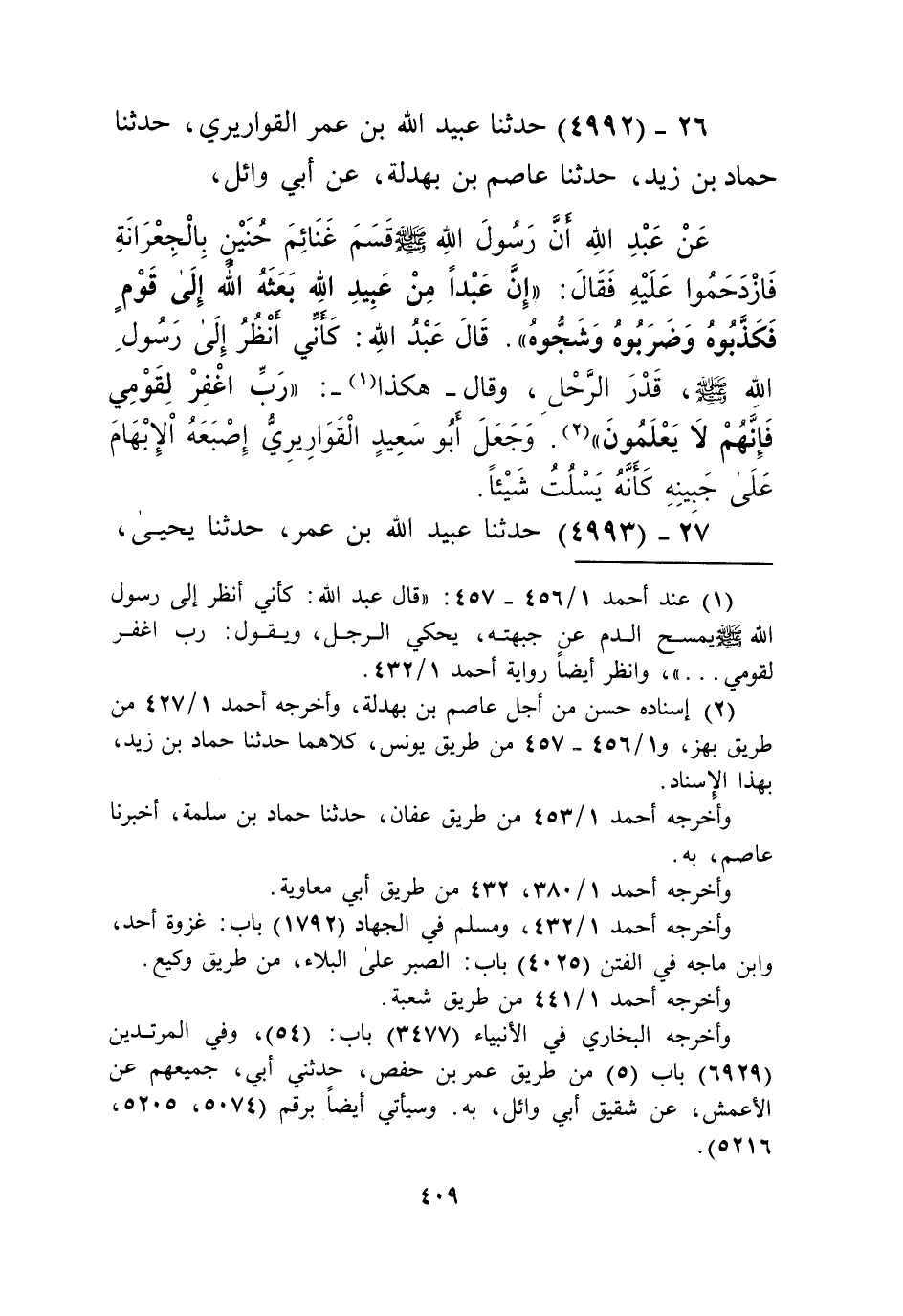4992 - حَدَّثَنَا عُبَيْدُ اللَّهِ بْنُ عُمَرَ الْقَوَارِيرِيُّ، حَدَّثَنَا حَمَّادُ بْنُ زَيْدٍ، حَدَّثَنَا عَاصِمُ بْنُ بَهْدَلَةَ، عَنْ أَبِي وَائِلٍ، عَنْ عَبْدِ اللَّهِ، أَنَّ رَسُولَ اللَّهِ صَلَّى اللهُ عَلَيْهِ وَسَلَّمَ " §قَسَمَ غَنَائِمَ حُنَيْنٍ بِالْجِعْرَانَةِ، فَازْدَحَمُوا عَلَيْهِ فَقَالَ: «إِنَّ عَبْدًا مِنْ عَبِيدِ اللَّهِ بَعَثَهُ اللَّهُ إِلَى قَوْمٍ فَكَذَّبُوهُ وَضَرَبُوهُ وَشَجُّوهُ». قَالَ عَبْدُ اللَّهِ: كَأَنِّي أَنْظُرُ إِلَى رَسُولِ اللَّهِ صَلَّى اللهُ عَلَيْهِ وَسَلَّمَ قَدْرَ الرَّحْلِ وَقَالَ - هَكَذَا -: «رَبِّ اغْفِرْ لِقَوْمِي فَإِنَّهُمْ لَا يَعْلَمُونَ» وَجَعَلَ أَبُو سَعِيدٍ الْقَوَارِيرِيُّ إِصْبَعَهُ الْإِبْهَامَ عَلَى جَبِينِهِ كَأَنَّهُ يَسْلُتُ شَيْئًاKإسناده حسن