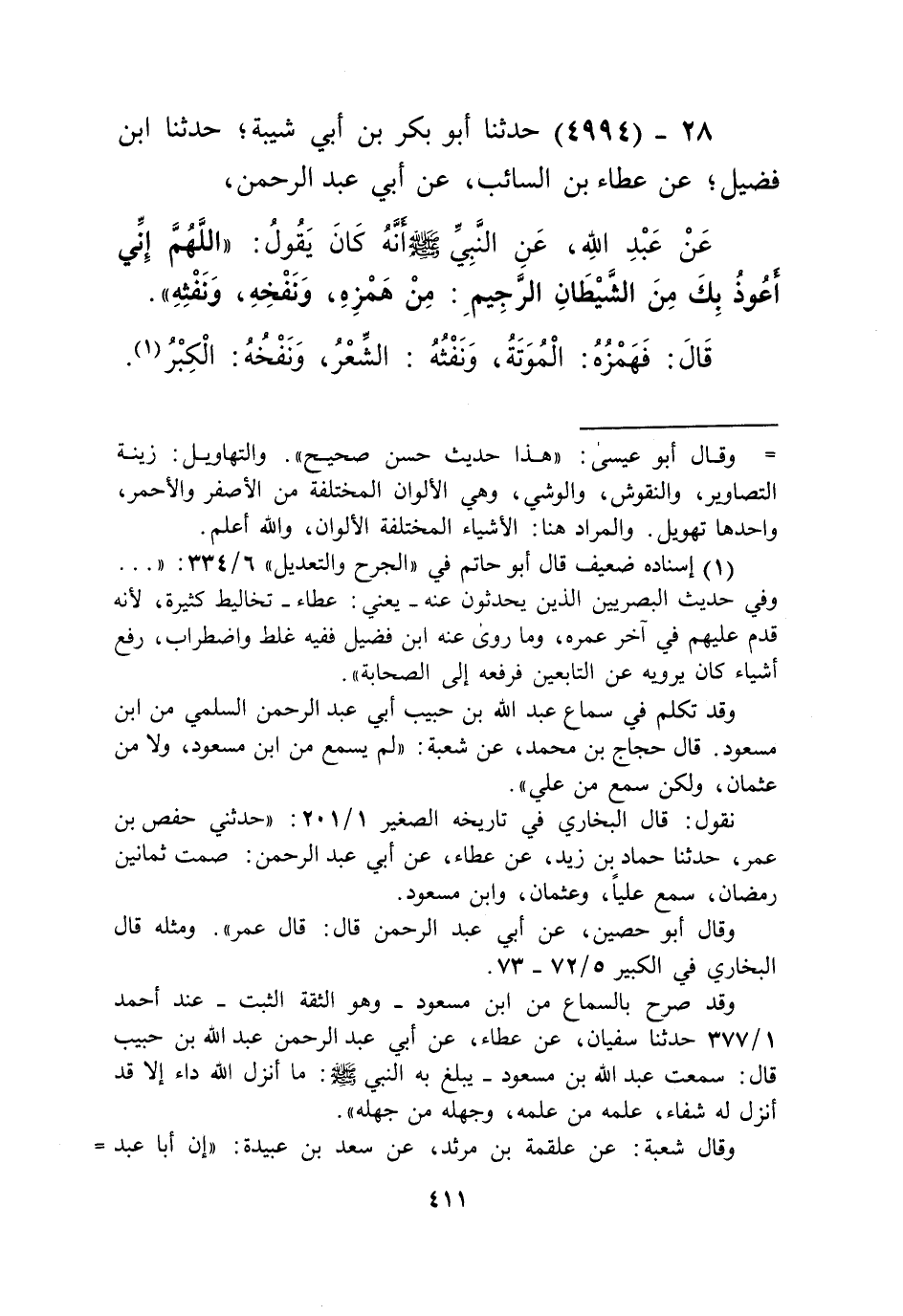 4994 - حَدَّثَنَا أَبُو بَكْرِ بْنُ أَبِي شَيْبَةَ، حَدَّثَنَا ابْنُ فُضَيْلٍ، عَنْ عَطَاءِ بْنِ السَّائِبِ، عَنْ أَبِي عَبْدِ الرَّحْمَنِ، عَنْ عَبْدِ اللَّهِ، عَنِ النَّبِيِّ صَلَّى اللهُ عَلَيْهِ وَسَلَّمَ أَنَّهُ كَانَ يَقُولُ: " §اللَّهُمَّ إِنِّي أَعُوذُ بِكَ مِنَ الشَّيْطَانِ الرَّجِيمِ: مِنْ هَمْزِهِ، وَنَفْخِهِ، وَنَفْثِهِ " قَالَ: فَهَمْزُهُ الْمَوْتَةُ، وَنَفْثُهُ: الشِّعْرُ، وَنَفْخُهُ: الْكِبْرُKإسناده ضعيف