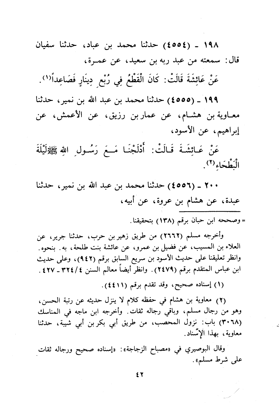 4555 - حَدَّثَنَا مُحَمَّدُ بْنُ عَبْدِ اللَّهِ بْنِ نُمَيْرٍ، حَدَّثَنَا مُعَاوِيَةُ بْنُ هِشَامٍ، عَنْ عَمَّارِ بْنِ رُزَيْقٍ، عَنِ الْأَعْمَشِ، عَنْ إِبْرَاهِيمَ، عَنِ الْأَسْوَدِ، عَنْ عَائِشَةَ قَالَتْ: «§أَدْلَجْنَا مَعَ رَسُولِ اللَّهِ صَلَّى اللهُ عَلَيْهِ وَسَلَّمَ لَيْلَةَ الْبَطْحَاءِ»