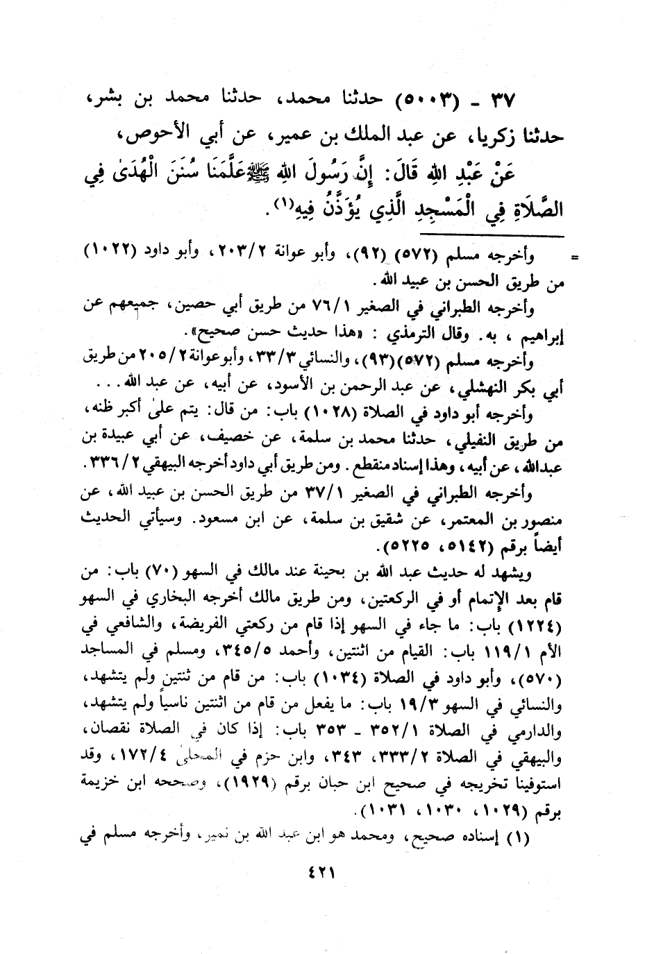 5003 - حَدَّثَنَا مُحَمَّدٌ، حَدَّثَنَا مُحَمَّدُ بْنُ بِشْرٍ، حَدَّثَنَا زَكَرِيَّا، عَنْ عَبْدِ الْمَلِكِ بْنِ عُمَيْرٍ، عَنْ أَبِي الْأَحْوَصِ، عَنْ عَبْدِ اللَّهِ قَالَ: إِنَّ رَسُولَ اللَّهِ صَلَّى اللهُ عَلَيْهِ وَسَلَّمَ «§عَلَّمَنَا سُنَنَ الْهُدَى فِي الصَّلَاةِ فِي الْمَسْجِدِ الَّذِي يُؤَذَّنُ فِيهِ» Kإسناده صحيح