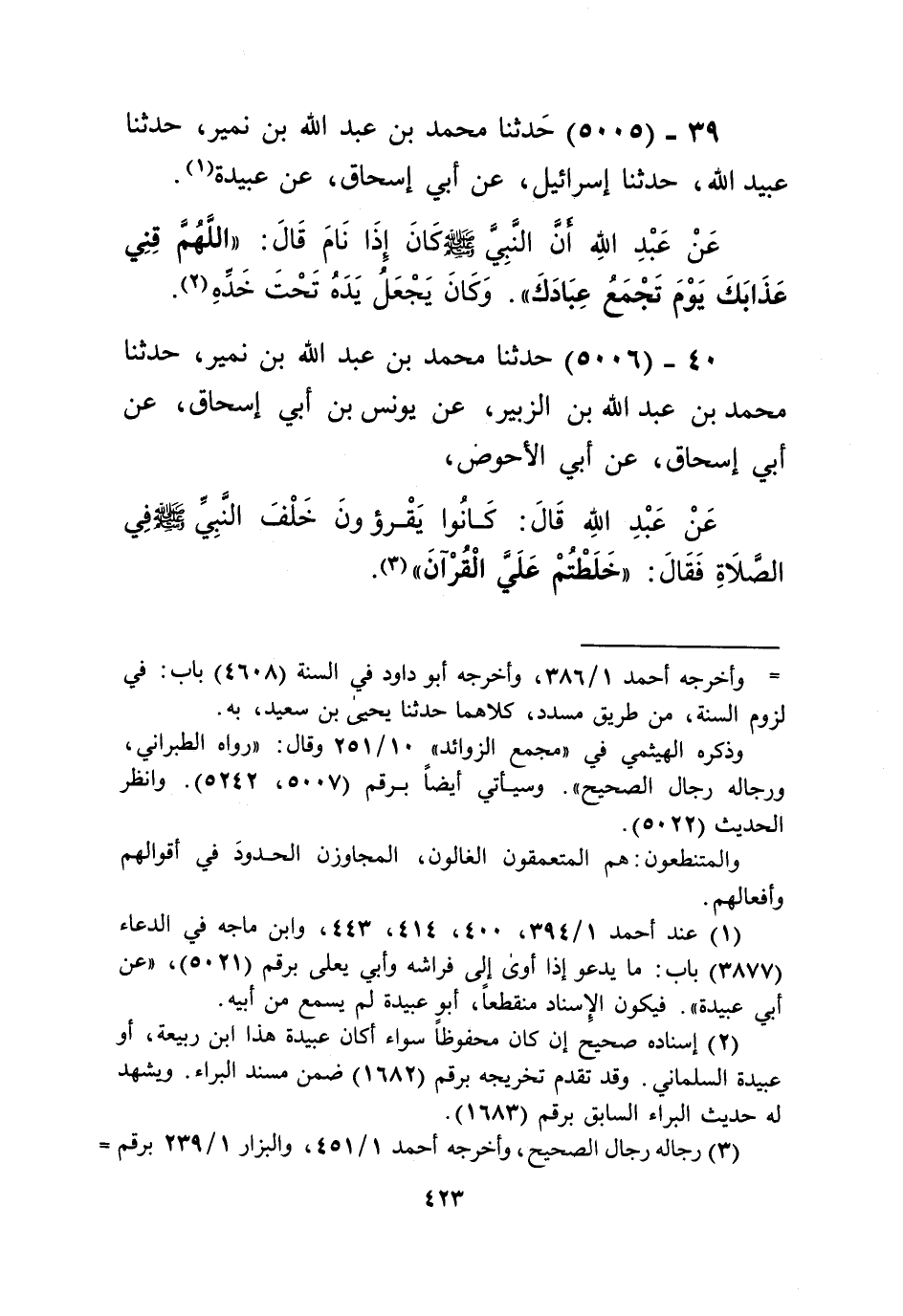 5005 - حَدَّثَنَا مُحَمَّدُ بْنُ عَبْدِ اللَّهِ بْنِ نُمَيْرٍ، حَدَّثَنَا عُبَيْدُ اللَّهِ، حَدَّثَنَا إِسْرَائِيلُ، عَنْ أَبِي إِسْحَاقَ، عَنْ عُبَيْدَةَ، عَنْ عَبْدِ اللَّهِ، أَنَّ النَّبِيَّ صَلَّى اللهُ عَلَيْهِ وَسَلَّمَ كَانَ " §إِذَا نَامَ قَالَ: «اللَّهُمَّ قِنِي عَذَابَكَ يَوْمَ تَجْمَعُ عِبَادَكَ» وَكَانَ يَجْعَلُ يَدَهُ تَحْتَ خَدِّهِKإسناده صحيح