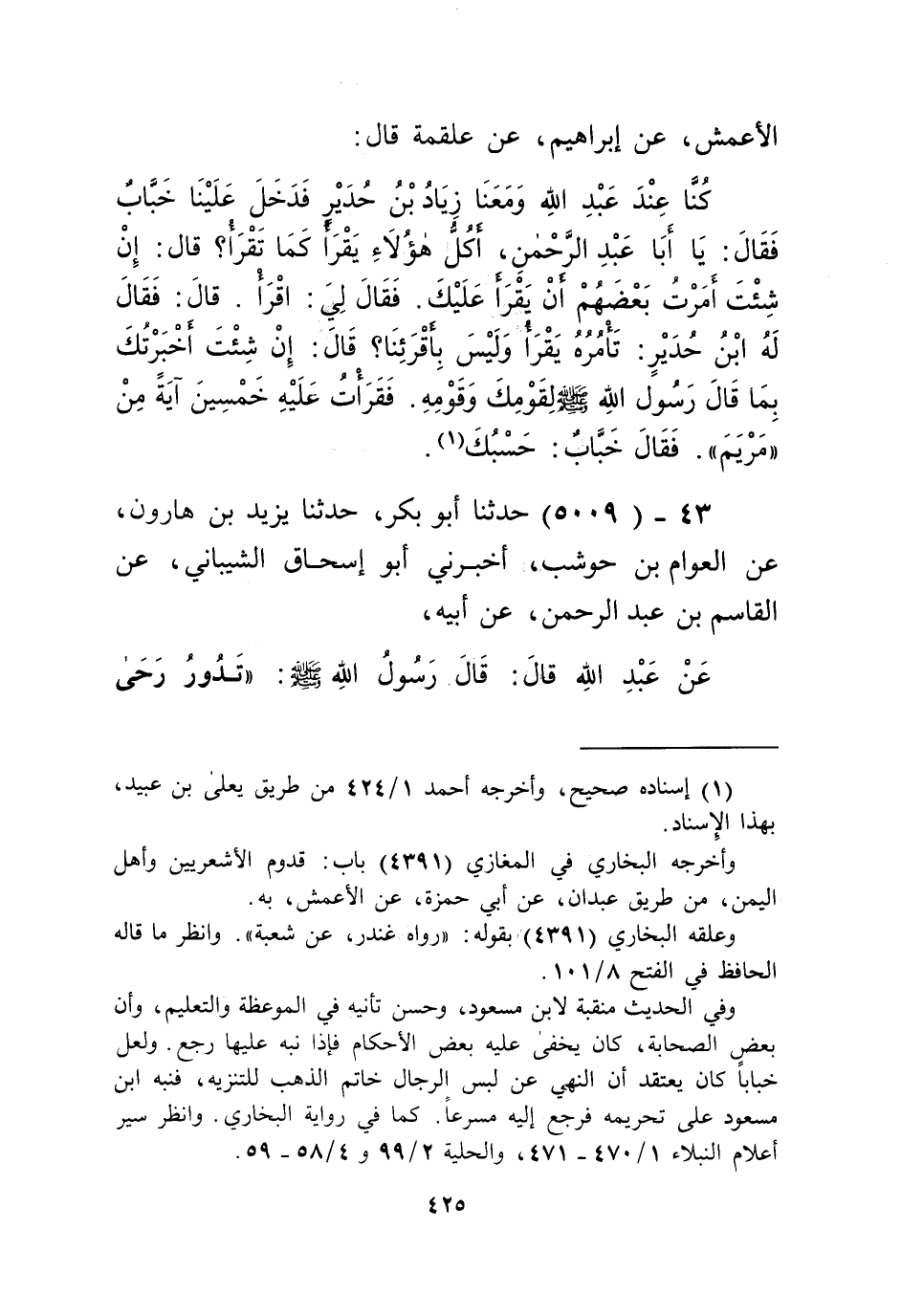 5009 - حَدَّثَنَا أَبُو بَكْرٍ، حَدَّثَنَا يَزِيدُ بْنُ هَارُونَ، عَنِ الْعَوَّامِ بْنِ حَوْشَبٍ، أَخْبَرَنِي أَبُو إِسْحَاقَ الشَّيْبَانِيُّ، عَنِ الْقَاسِمِ بْنِ عَبْدِ الرَّحْمَنِ، عَنْ أَبِيهِ، عَنْ عَبْدِ اللَّهِ قَالَ: قَالَ رَسُولُ اللَّهِ صَلَّى اللهُ عَلَيْهِ وَسَلَّمَ: «§تَدُورُ رَحَى الْإِسْلَامِ عَلَى رَأْسِ خَمْسٍ وَثَلَاثِينَ أَوْ سِتٍّ وَثَلَاثِينَ أَوْ سَبْعٍ وَثَلَاثِينَ، فَإِنْ هَلَكُوا فَسَبِيلُ مَنْ هَلَكَ، وَإِنْ بَقُوا بَقِيَ لَهُمْ دِينُهُمْ سَبْعِينَ عَامًا» Kإسناده صحيح