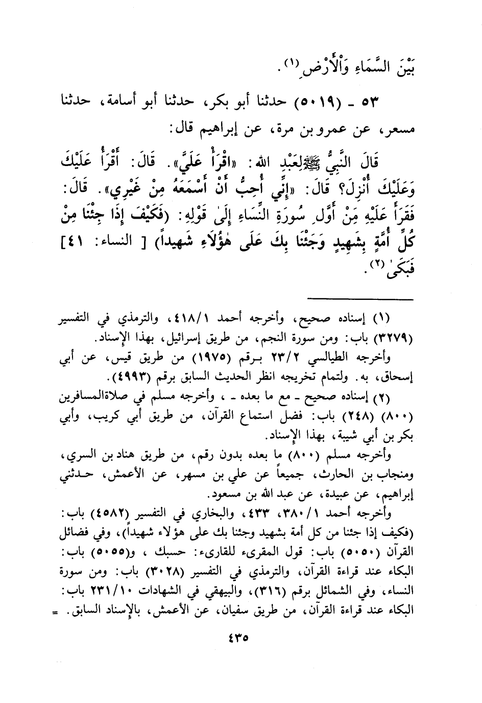 5019 - حَدَّثَنَا أَبُو بَكْرٍ، حَدَّثَنَا أَبُو أُسَامَةَ، حَدَّثَنَا مِسْعَرٌ، عَنْ عَمْرِو بْنِ مُرَّةَ، عَنْ إِبْرَاهِيمَ قَالَ: قَالَ النَّبِيُّ صَلَّى اللهُ عَلَيْهِ وَسَلَّمَ لِعَبْدِ اللَّهِ: «§اقْرَأْ عَلَيَّ». قَالَ: أَقْرَأُ عَلَيْكَ وَعَلَيْكَ أُنْزِلَ؟ قَالَ: «إِنِّي أُحِبُّ أَنْ أَسْمَعَهُ مِنْ غَيْرِي». قَالَ: فَقَرَأَ عَلَيْهِ مِنْ أَوَّلِ سُورَةِ النِّسَاءِ إِلَى قَوْلِهِ: {فَكَيْفَ إِذَا جِئْنَا مِنْ كُلِّ أُمَّةٍ بِشَهِيدٍ وَجِئْنَا بِكَ عَلَى هَؤُلَاءِ شَهِيدًا} [النساء: 41] فَبَكَى "Kإسناده صحيح