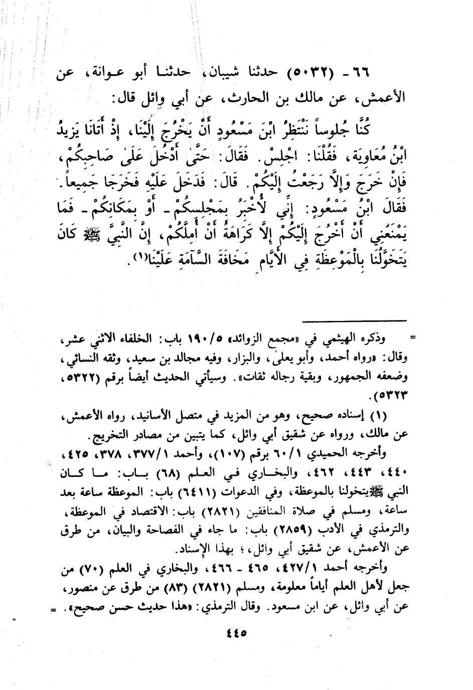 5032 - حَدَّثَنَا شَيْبَانُ، حَدَّثَنَا أَبُو عَوَانَةَ، عَنِ الْأَعْمَشِ، عَنْ مَالِكِ بْنِ الْحَارِثِ، عَنْ أَبِي وَائِلٍ قَالَ: كُنَّا جُلُوسًا نَنْتَظِرُ ابْنَ مَسْعُودٍ أَنْ يَخْرُجَ إِلَيْنَا، إِذْ أَتَانًا يَزِيدُ بْنُ مُعَاوِيَةَ فَقُلْنَا: اجْلِسْ. فَقَالَ: حَتَّى أَدْخُلَ عَلَى صَاحِبِكُمْ، فَإِنْ خَرَجَ وَإِلَّا رَجَعْتُ إِلَيْكُمْ. قَالَ: فَدَخَلَ عَلَيْهِ فَخَرَجَا جَمِيعًا. فَقَالَ ابْنُ مَسْعُودٍ: إِنِّي لَأُخْبَرُ بِمَجْلِسِكُمْ - أَوْ بِمَكَانِكُمْ - فَمَا يَمْنَعُنِي أَنْ أَخْرُجَ إِلَيْكُمْ إِلَّا كَرَاهَةَ أَنْ أُمِلَّكُمْ، «§إِنَّ النَّبِيَّ صَلَّى اللهُ عَلَيْهِ وَسَلَّمَ كَانَ يَتَخَوَّلُنَا بِالْمَوْعِظَةِ فِي الْأَيَّامِ مَخَافَةَ السَّآمَةِ عَلَيْنَا» Kإسناده صحيح