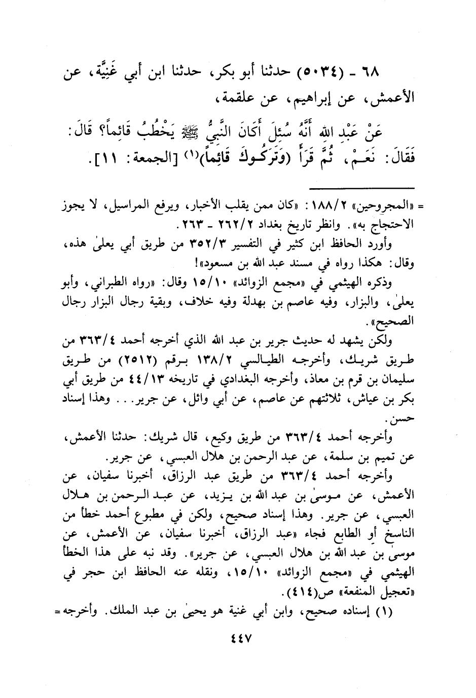 5034 - حَدَّثَنَا أَبُو بَكْرٍ، حَدَّثَنَا ابْنُ أَبِي غَنِيَّةَ، عَنِ الْأَعْمَشِ، عَنْ إِبْرَاهِيمَ، عَنْ عَلْقَمَةَ، عَنْ عَبْدِ اللَّهِ، أَنَّهُ سُئِلَ: " §أَكَانَ النَّبِيُّ صَلَّى اللهُ عَلَيْهِ وَسَلَّمَ يَخْطُبُ قَائِمًا؟ قَالَ: فَقَالَ: نَعَمْ. ثُمَّ قَرَأَ {وَتَرَكُوكَ قَائِمًا} [الجمعة: 11] "Kإسناده صحيح