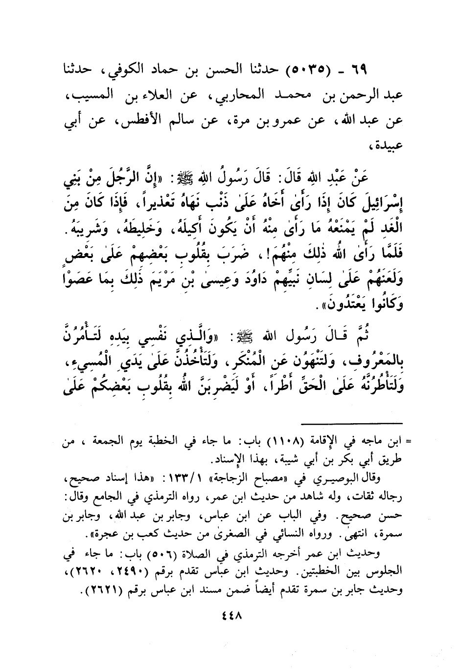 5035 - حَدَّثَنَا الْحَسَنُ بْنُ حَمَّادٍ الْكُوفِيُّ، حَدَّثَنَا عَبْدُ الرَّحْمَنِ بْنُ مُحَمَّدٍ الْمُحَارِبِيُّ، عَنِ الْعَلَاءِ بْنِ الْمُسَيَّبِ، عَنْ عَبْدِ اللَّهِ، عَنْ عَمْرِو بْنِ مُرَّةَ، عَنْ سَالِمٍ الْأَفْطَسِ، عَنْ أَبِي عُبَيْدَةَ، عَنْ عَبْدِ اللَّهِ قَالَ: قَالَ رَسُولُ اللَّهِ صَلَّى اللهُ عَلَيْهِ وَسَلَّمَ: «§إِنَّ الرَّجُلَ مِنْ بَنِي إِسْرَائِيلَ كَانَ إِذَا رَأَى أَخَاهُ عَلَى ذَنْبٍ نَهَاهُ تَعْذِيرًا، فَإِذَا كَانَ مِنَ الْغَدِ لَمْ يَمْنَعْهُ مَا رَأَى مِنْهُ أَنْ يَكُونَ أَكِيلَهُ وَخَلِيطَهُ وَشَرِيبَهُ، فَلَمَّا رَأَى اللَّهُ ذَلِكَ مِنْهُمْ ضَرَبَ بِقُلُوبِ بَعْضِهِمْ عَلَى بَعْضٍ، وَلَعَنَهُمْ عَلَى لِسَانِ نَبِيِّهِمْ دَاوُدَ وَعِيسَى ابْنِ مَرْيَمَ، ذَلِكَ بِمَا عَصَوْا وَكَانُوا يَعْتَدُونَ». ثُمَّ قَالَ رَسُولُ اللَّهِ صَلَّى اللهُ عَلَيْهِ وَسَلَّمَ: «وَالَّذِي نَفْسِي بِيَدِهِ لَتَأْمُرُنَّ بِالْمَعْرُوفِ، وَلَتَنْهَوُنَّ عَنِ الْمُنْكَرِ، وَلَتَأْخُذُنَّ عَلَى يَدَيِ الْمُسِيءِ، وَلَتَأْطُرُنَّهُ عَلَى الْحَقِّ أَطْرًا، أَوْ لَيَضْرِبَنَّ اللَّهُ بِقُلُوبِ بَعْضِكُمْ عَلَى بَعْضٍ وَلَيَلْعَنَنَّكُمْ كَمَا لَعَنَهُمْ» Kإسناده ضعيف