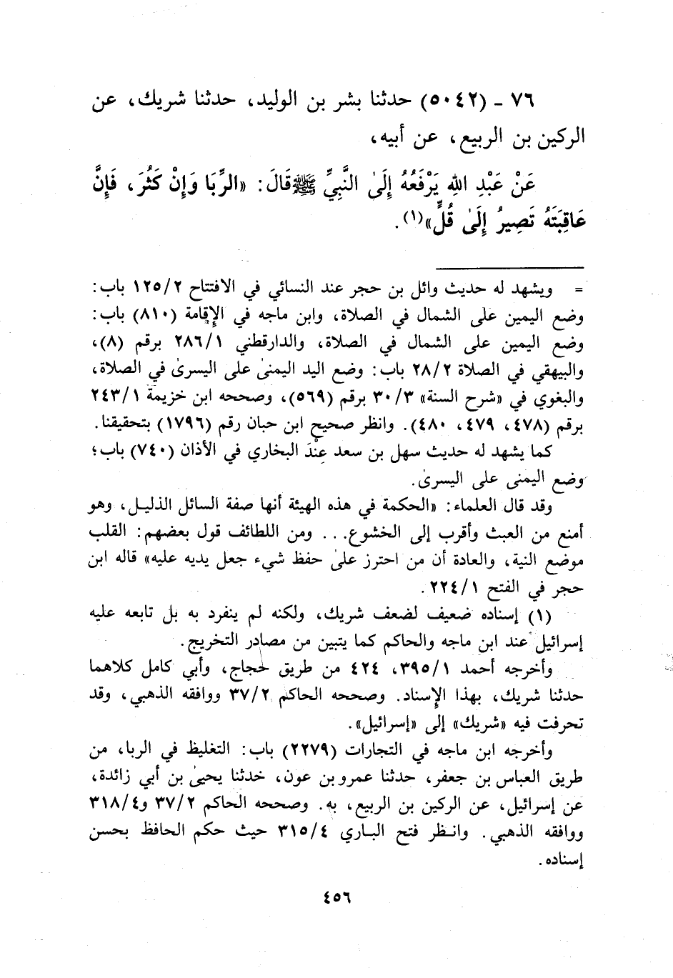 5042 - حَدَّثَنَا بِشْرُ بْنُ الْوَلِيدِ، حَدَّثَنَا شَرِيكٌ، عَنِ الرُّكَيْنِ بْنِ الرَّبِيعِ، عَنْ أَبِيهِ، عَنْ عَبْدِ اللَّهِ يَرْفَعُهُ إِلَى النَّبِيِّ صَلَّى اللهُ عَلَيْهِ وَسَلَّمَ قَالَ: «§الرِّبَا وَإِنْ كَثُرَ، فَإِنَّ عَاقِبَتَهُ تَصِيرُ إِلَى قُلٍّ» Kإسناده ضعيف