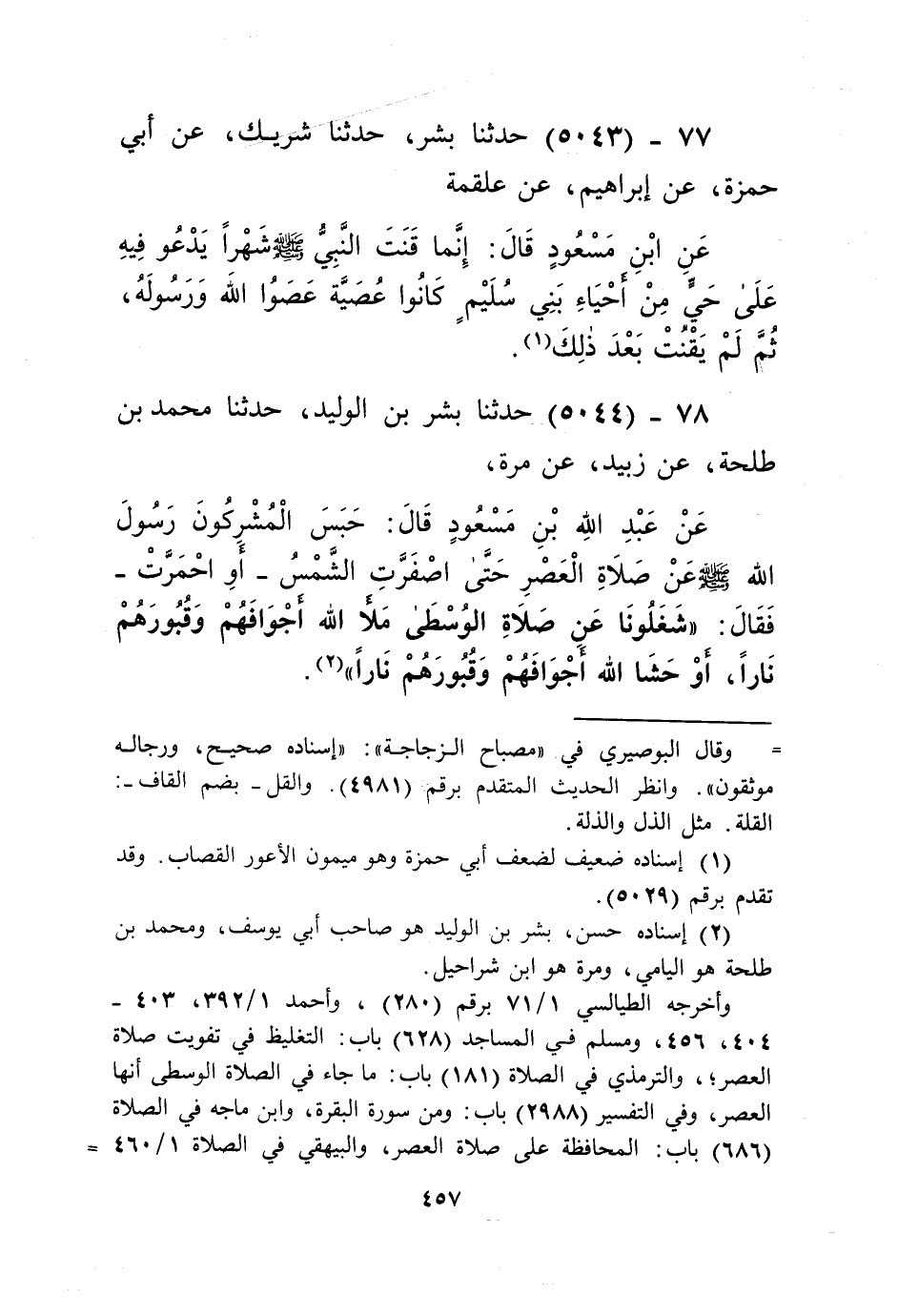 5044 - حَدَّثَنَا بِشْرُ بْنُ الْوَلِيدِ، حَدَّثَنَا مُحَمَّدُ بْنُ طَلْحَةَ، عَنْ زُبَيْدٍ، عَنْ مُرَّةَ، عَنْ عَبْدِ اللَّهِ بْنِ مَسْعُودٍ قَالَ: حَبَسَ الْمُشْرِكُونَ رَسُولَ اللَّهِ صَلَّى اللهُ عَلَيْهِ وَسَلَّمَ عَنْ صَلَاةِ الْعَصْرِ حَتَّى اصْفَرَّتِ الشَّمْسُ - أَوِ احْمَرَّتْ - فَقَالَ: «§شَغَلُونَا عَنْ صَلَاةِ الْوُسْطَى مَلَأَ اللَّهُ أَجْوَافَهُمْ وَقُبُورَهُمْ نَارًا، أَوْ حَشَا اللَّهُ أَجْوَافَهُمْ وَقُبُورَهُمْ نَارًا» Kإسناده حسن