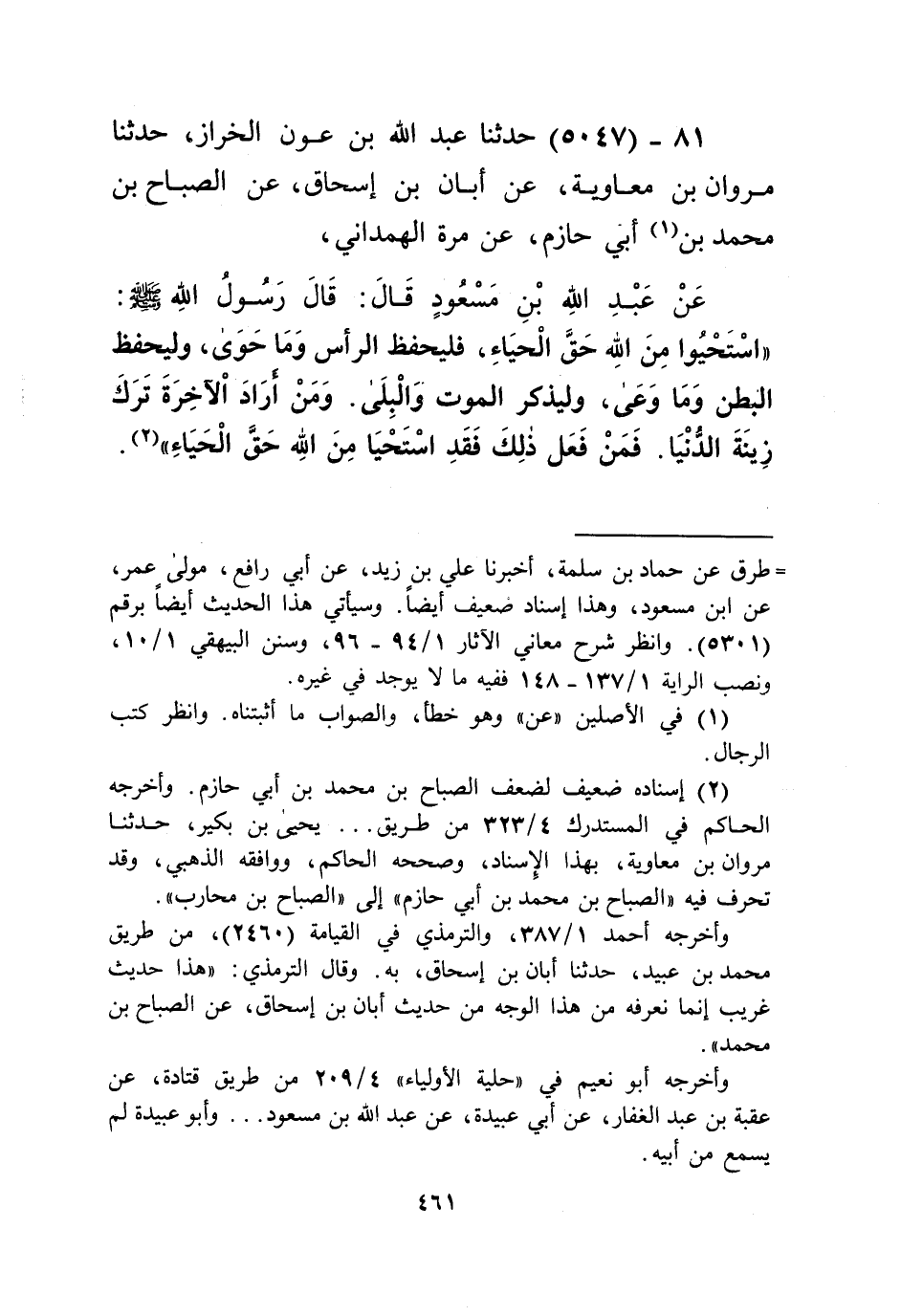 5047 - حَدَّثَنَا عَبْدُ اللَّهِ بْنُ عَوْنٍ الْخَرَّازُ، حَدَّثَنَا مَرْوَانُ بْنُ مُعَاوِيَةَ، عَنْ أَبَانِ بْنِ إِسْحَاقَ، عَنِ الصَّبَّاحِ بْنِ مُحَمَّدِ بْنِ أَبِي حَازِمٍ، عَنْ مُرَّةَ الْهَمْدَانِيِّ، عَنْ عَبْدِ اللَّهِ بْنِ مَسْعُودٍ قَالَ: قَالَ رَسُولُ اللَّهِ صَلَّى اللهُ عَلَيْهِ وَسَلَّمَ: «§اسْتَحْيُوا مِنَ اللَّهِ حَقَّ الْحَيَاءِ، فَلْيَحْفَظِ الرَّأْسَ وَمَا حَوَى، وَلْيَحْفَظِ الْبَطْنَ وَمَا وَعَى، وَلْيَذْكُرِ الْمَوْتَ وَالْبِلَى، وَمَنْ أَرَادَ الْآخِرَةَ تَرَكَ زِينَةَ الدُّنْيَا، فَمَنْ فَعَلَ ذَلِكَ فَقَدِ اسْتَحْيَا مِنَ اللَّهِ حَقَّ الْحَيَاءِ» Kإسناده ضعيف