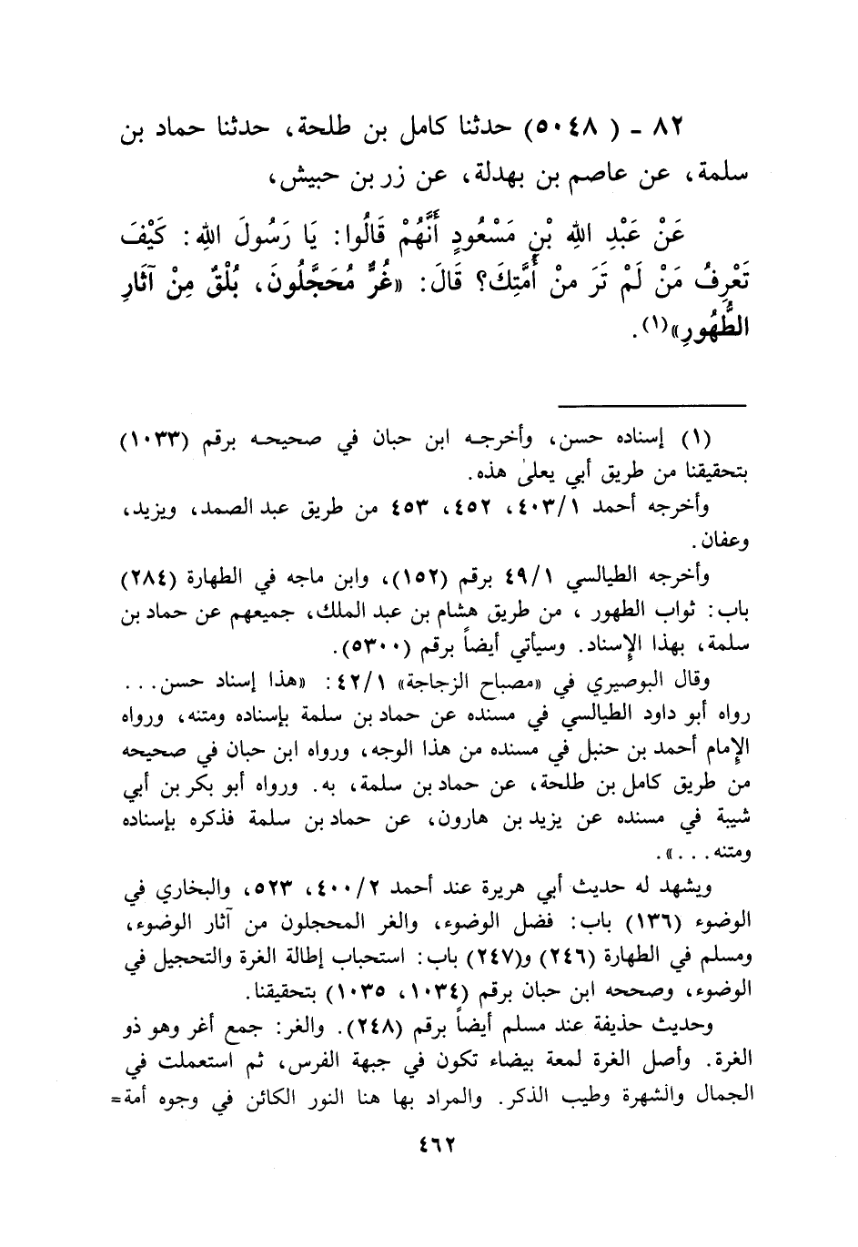 5048 - حَدَّثَنَا كَامِلُ بْنُ طَلْحَةَ، حَدَّثَنَا حَمَّادُ بْنُ سَلَمَةَ، عَنْ عَاصِمِ بْنِ بَهْدَلَةَ، عَنْ زِرِّ بْنِ حُبَيْشٍ، عَنْ عَبْدِ اللَّهِ بْنِ مَسْعُودٍ، أَنَّهُمْ قَالُوا: " §يَا رَسُولَ اللَّهِ كَيْفَ تَعْرِفُ مَنْ لَمْ تَرَ مِنْ أُمَّتِكَ؟ قَالَ: «غُرٌّ مُحَجَّلُونَ بُلْقٌ مِنْ آثَارِ الطُّهُورِ» Kإسناده حسن