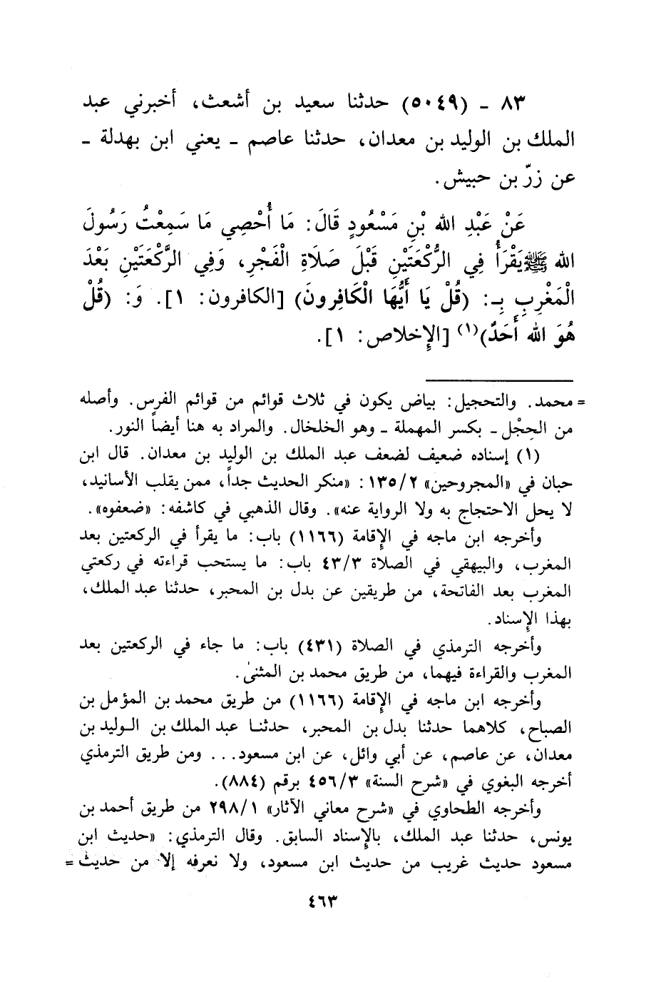 5049 - حَدَّثَنَا سَعِيدُ بْنُ أَشْعَثَ، أَخْبَرَنِي عَبْدُ الْمَلِكِ بْنُ الْوَلِيدِ بْنِ مَعْدَانَ، حَدَّثَنَا عَاصِمٌ، يَعْنِي ابْنَ بَهْدَلَةَ، عَنْ زِرِّ بْنِ حُبَيْشٍ، عَنْ عَبْدِ اللَّهِ بْنِ مَسْعُودٍ قَالَ: " §مَا أُحْصِي مَا سَمِعْتُ رَسُولَ اللَّهِ صَلَّى اللهُ عَلَيْهِ وَسَلَّمَ يَقْرَأُ فِي الرَّكْعَتَيْنِ قَبْلَ صَلَاةِ الْفَجْرِ، وَفِي الرَّكْعَتَيْنِ بَعْدَ الْمَغْرِبِ بِـ {قُلْ يَا أَيُّهَا الْكَافِرُونَ} [الكافرون: 1] وَ {قُلْ هُوَ اللَّهُ أَحَدٌ} [الإخلاص: 1] "Kإسناده ضعيف