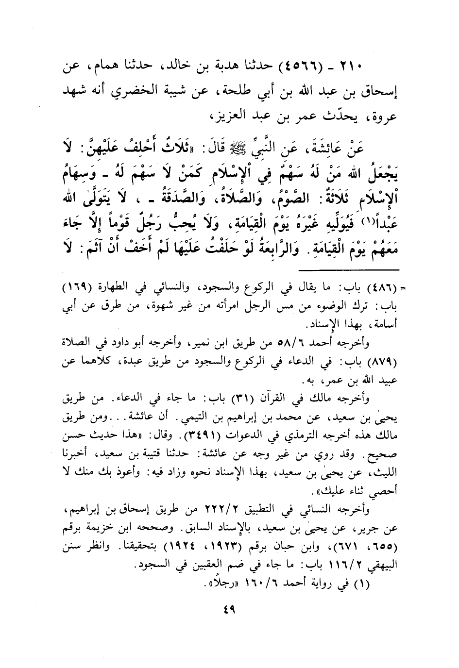 4566 - حَدَّثَنَا هُدْبَةُ بْنُ خَالِدٍ، حَدَّثَنَا هَمَّامٌ، عَنْ إِسْحَاقَ بْنِ عَبْدِ اللَّهِ بْنِ أَبِي طَلْحَةَ، عَنْ شَيْبَةَ الْخُضَرِيِّ أَنَّهُ شَهِدَ عُرْوَةَ يُحَدِّثُ عُمَرَ بْنَ عَبْدِ الْعَزِيزِ، عَنْ عَائِشَةَ، عَنِ النَّبِيِّ صَلَّى اللهُ عَلَيْهِ وَسَلَّمَ قَالَ: " §ثَلَاثٌ أَحْلِفُ عَلَيْهِنَّ: لَا يَجْعَلُ اللَّهُ مَنْ لَهُ سَهْمٌ فِي الْإِسْلَامِ كَمَنْ لَا سَهْمَ لَهُ - وَسِهَامُ الْإِسْلَامِ ثَلَاثَةٌ: الصَّوْمُ وَالصَّلَاةُ وَالصَّدَقَةُ - لَا يَتَوَلَّى اللَّهُ عَبْدًا فَيُوَلِّيَهُ غَيْرَهُ يَوْمَ الْقِيَامَةِ , وَلَا يُحِبُّ رَجُلٌ قَوْمًا إِلَّا جَاءَ مَعَهُمْ يَوْمَ الْقِيَامَةِ , وَالرَّابِعَةُ لَوْ حَلَفْتُ عَلَيْهَا لَمْ أَخَفْ أَنْ آثَمَ: لَا يَسْتُرُ اللَّهُ عَلَى عَبْدِهِ فِي الدُّنْيَا إِلَّا سَتَرَ عَلَيْهِ فِي الْآخِرَةِ ". فَقَالَ عُمَرُ بْنُ عَبْدِ الْعَزِيزِ: إِذَا سَمِعْتُمْ مِثْلَ هَذَا مِنْ مِثْلِ عُرْوَةَ فَاحْفَظُوهُ. -[50]-