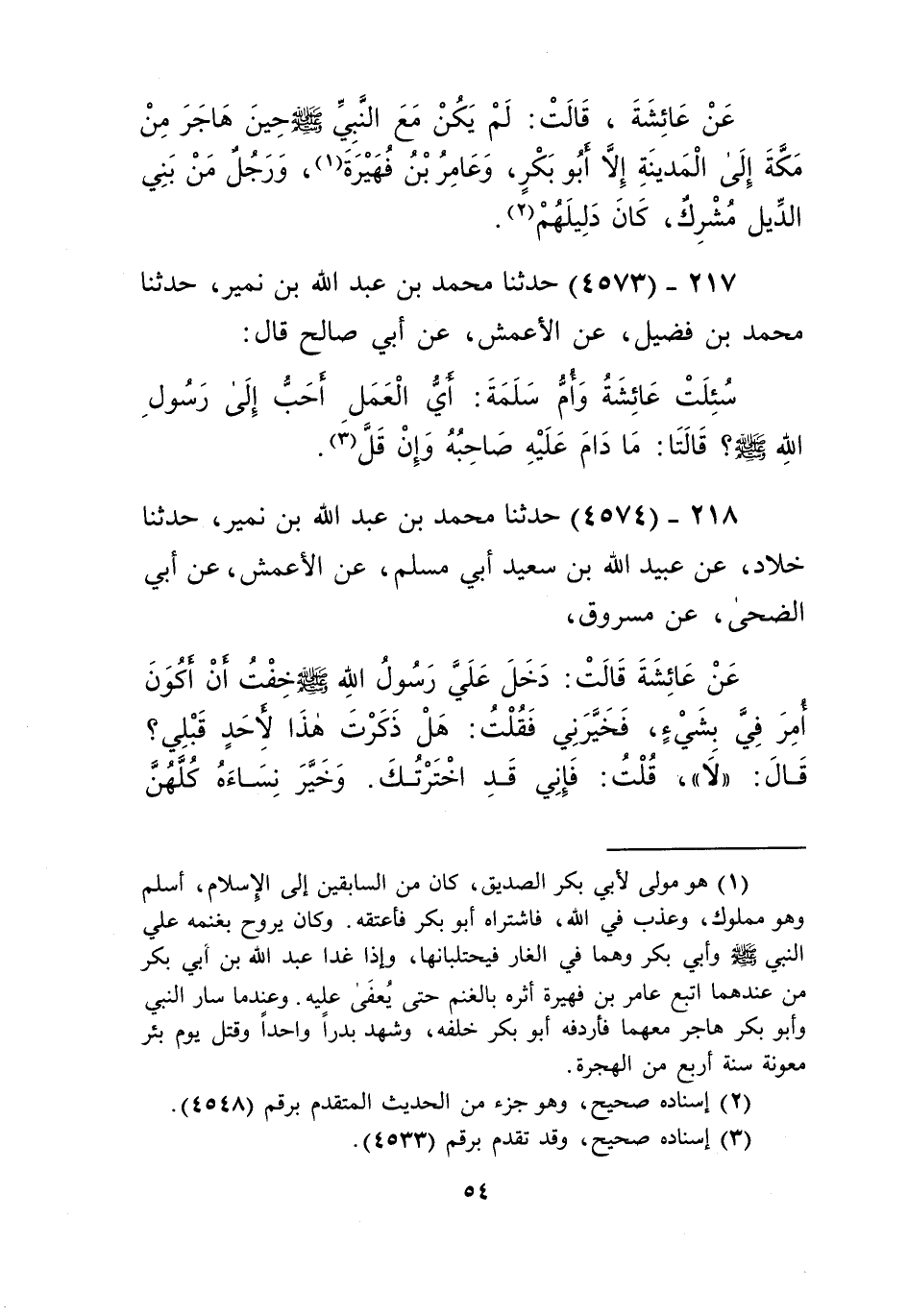 4573 - حَدَّثَنَا مُحَمَّدُ بْنُ عَبْدِ اللَّهِ بْنِ نُمَيْرٍ، حَدَّثَنَا مُحَمَّدُ بْنُ فُضَيْلٍ، عَنِ الْأَعْمَشِ، عَنْ أَبِي صَالِحٍ قَالَ: سُئِلَتْ عَائِشَةُ وَأُمَّ سَلَمَةَ: " §أَيُّ الْعَمَلِ أَحَبُّ إِلَى رَسُولِ اللَّهِ صَلَّى اللهُ عَلَيْهِ وَسَلَّمَ؟ قَالَتَا: مَا دَامَ عَلَيْهِ صَاحِبُهُ وَإِنْ قَلَّ "Kإسناده صحيح