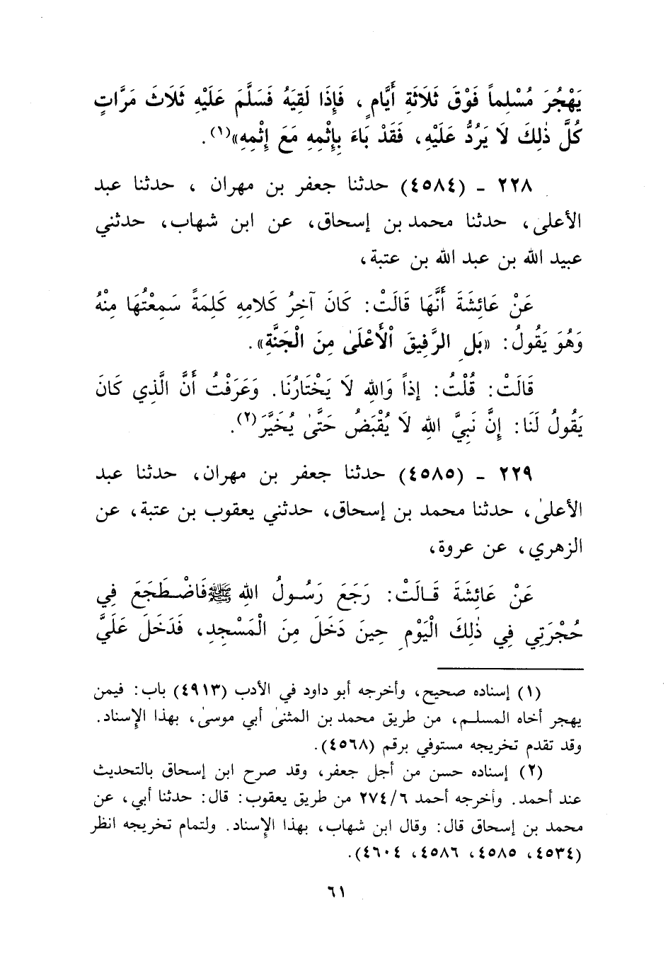 4585 - حَدَّثَنَا جَعْفَرُ بْنُ مِهْرَانَ، حَدَّثَنَا عَبْدُ الْأَعْلَى، حَدَّثَنَا مُحَمَّدُ بْنُ إِسْحَاقَ، حَدَّثَنِي يَعْقُوبُ بْنُ عُتْبَةَ، عَنِ الزُّهْرِيِّ،، عَنْ عُرْوَةَ، عَنْ عَائِشَةَ قَالَتْ: رَجَعَ رَسُولُ اللَّهِ صَلَّى اللهُ عَلَيْهِ وَسَلَّمَ فَاضْطَجَعَ فِي حُجْرَتِي فِي ذَلِكَ الْيَوْمِ حِينَ دَخَلَ مِنَ الْمَسْجِدِ، فَدَخَلَ عَلَيَّ رَجُلٌ مِنْ آلِ أَبِي بَكْرٍ وَفِي يَدِهِ سِوَاكٌ أَخْضَرُ قَالَتْ: فَنَظَرَ إِلَيْهِ رَسُولُ اللَّهِ صَلَّى اللهُ عَلَيْهِ وَسَلَّمَ وَهُوَ فِي يَدِهِ نَظَرًا عَرَفْتُ أَنَّهُ يُرِيدُهُ. قُلْتُ: يَا رَسُولَ اللَّهِ أَتُحِبُّ أَنْ أُعْطِيَكَ هَذَا السِّوَاكَ؟ قَالَ: «نَعَمْ». فَأَخَذْتُهُ فَمَضَغْتُهُ لَهُ حَتَّى لَيَّنْتُهُ، ثُمَّ أَعْطَيْتُهُ إِيَّاهُ -[62]-. قَالَتْ: فَاسْتَنَّ بِهِ كَأَحْسَنَ مَا رَأَيْتُهُ يَسْتَنُّ بِسِوَاكٍ قَبْلَهُ قَالَتْ: ثُمَّ وَضَعَهُ " §فَوَجَدْتُ رَسُولَ اللَّهِ صَلَّى اللهُ عَلَيْهِ وَسَلَّمَ يَثْقُلُ فِي حِجْرِي قَالَتْ: فَذَهَبْتُ أَنْظُرُ فِي وَجْهِهِ فَإِذَا بَصَرُهُ قَدْ شَخَصَ وَهُوَ يَقُولُ: «بَلِ الرَّفِيقَ الْأَعْلَى مِنَ الْجَنَّةِ». قَالَتْ: فَقُلْتُ: خُيِّرْتَ فَاخْتَرْتَ وَالَّذِي بَعَثَكَ بِالْحَقِّ قَالَتْ: وَقُبِضَ رَسُولُ اللَّهِ صَلَّى اللهُ عَلَيْهِ وَسَلَّمَ "Kإسناده حسن