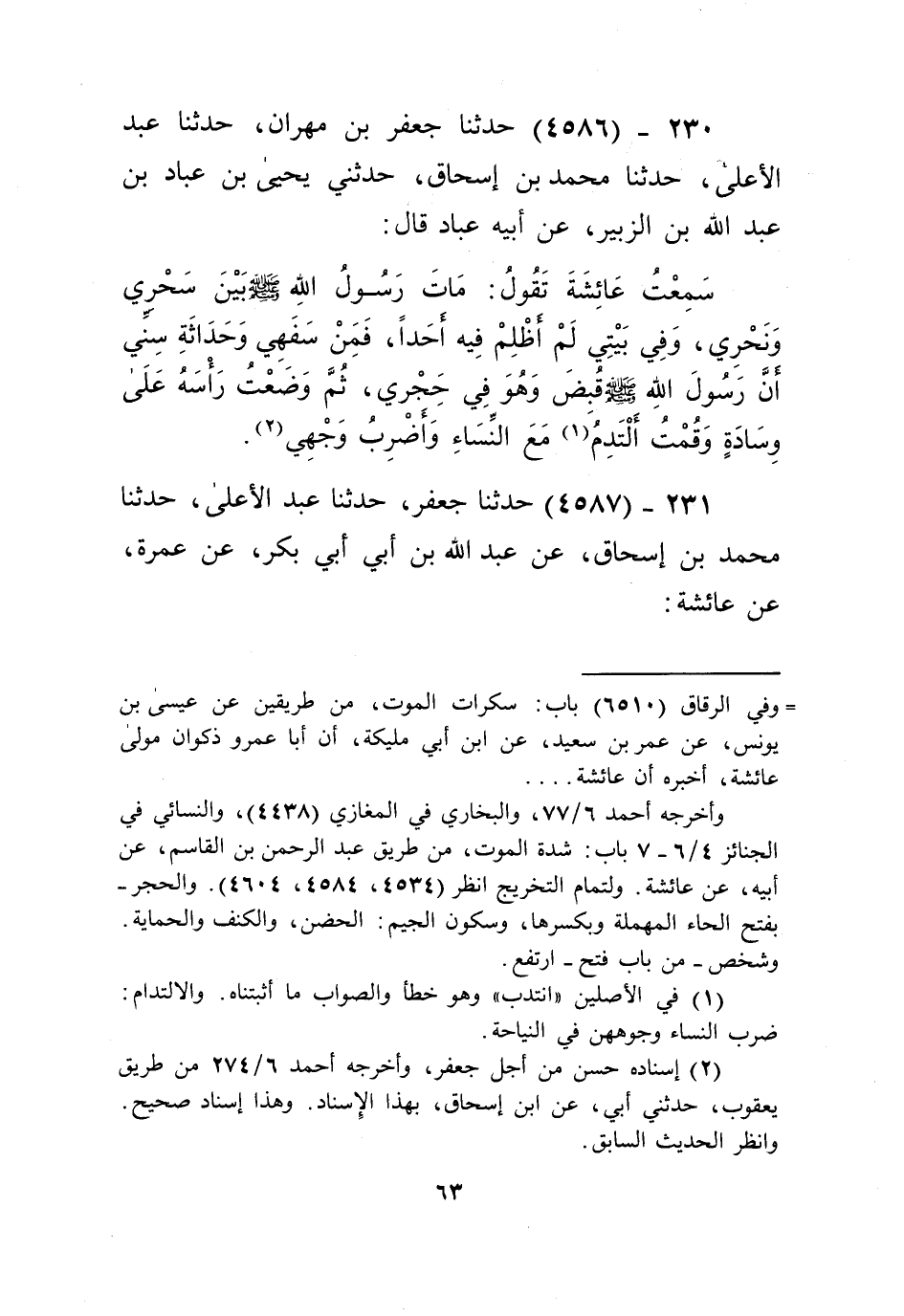 4586 - حَدَّثَنَا جَعْفَرُ بْنُ مِهْرَانَ، حَدَّثَنَا عَبْدُ الْأَعْلَى، حَدَّثَنَا مُحَمَّدُ بْنُ إِسْحَاقَ، حَدَّثَنِي يَحْيَى بْنُ عَبَّادِ بْنِ عَبْدِ اللَّهِ بْنِ الزُّبَيْرِ، عَنْ أَبِيهِ عَبَّادٍ قَالَ: سَمِعْتُ عَائِشَةَ تَقُولُ: مَاتَ رَسُولُ اللَّهِ صَلَّى اللهُ عَلَيْهِ وَسَلَّمَ بَيْنَ سَحْرِي وَنَحْرِي، وَفِي بَيْتِي لَمْ أَظْلِمْ فِيهِ أَحَدًا. فَمِنْ سَفَهِي وَحَدَاثَةِ سِنِّي أَنَّ «§رَسُولَ اللَّهِ صَلَّى اللهُ عَلَيْهِ وَسَلَّمَ قُبِضَ وَهُوَ فِي حِجْرِي، ثُمَّ وَضَعْتُ رَأْسَهُ عَلَى وِسَادَةٍ وَقُمْتُ أَلْتَدِمُ مَعَ النِّسَاءِ وَأَضْرِبُ وَجْهِي» Kإسناده حسن