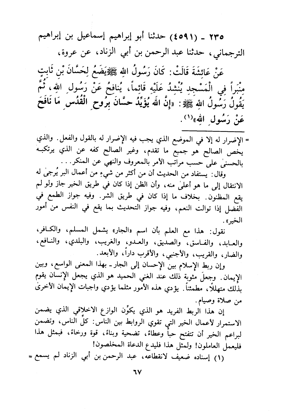 4591 - حَدَّثَنَا أَبُو إِبْرَاهِيمَ إِسْمَاعِيلُ بْنُ إِبْرَاهِيمَ التَّرْجُمَانِيُّ، حَدَّثَنَا عَبْدُ الرَّحْمَنِ بْنُ أَبِي الزِّنَادِ، عَنْ عُرْوَةَ، عَنْ عَائِشَةَ قَالَتْ: كَانَ رَسُولُ اللَّهِ صَلَّى اللهُ عَلَيْهِ وَسَلَّمَ يَضَعُ لِحَسَّانِ بْنِ ثَابِتٍ مِنْبَرًا فِي الْمَسْجِدِ يُنْشِدُ عَلَيْهِ قَائِمًا. يُنَافِحُ عَنْ رَسُولِ اللَّهِ، ثُمَّ يَقُولُ رَسُولُ اللَّهِ صَلَّى اللهُ عَلَيْهِ وَسَلَّمَ: «§إِنَّ اللَّهَ يُؤَيِّدُ حَسَّانَ بِرُوحِ الْقُدُسِ مَا نَافَحَ عَنْ رَسُولِ اللَّهِ» Kإسناده ضعيف