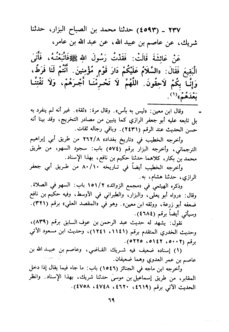 4593 - حَدَّثَنَا مُحَمَّدُ بْنُ الصَّبَّاحِ الْبَزَّارُ، حَدَّثَنَا شَرِيكٌ، عَنْ عَاصِمِ بْنِ عُبَيْدِ اللَّهِ، عَنْ عَبْدِ اللَّهِ بْنِ عَامِرٍ، عَنْ عَائِشَةَ قَالَتْ: فَقَدْتُ رَسُولَ اللَّهِ صَلَّى اللهُ عَلَيْهِ وَسَلَّمَ فَاتَّبَعْتُهُ، فَأَتَى الْبَقِيعَ فَقَالَ: «§السَّلَامُ عَلَيْكُمْ دَارَ قَوْمٍ مُؤْمِنِينَ. أَنْتُمْ لَنَا فَرَطٌ، وَإِنَّا بِكُمْ لَاحِقُونَ. اللَّهُمَّ لَا تَحْرِمْنَا أَجْرَهُمْ وَلَا تَفْتِنَّا بَعْدَهُمْ» Kإسناده ضعيف