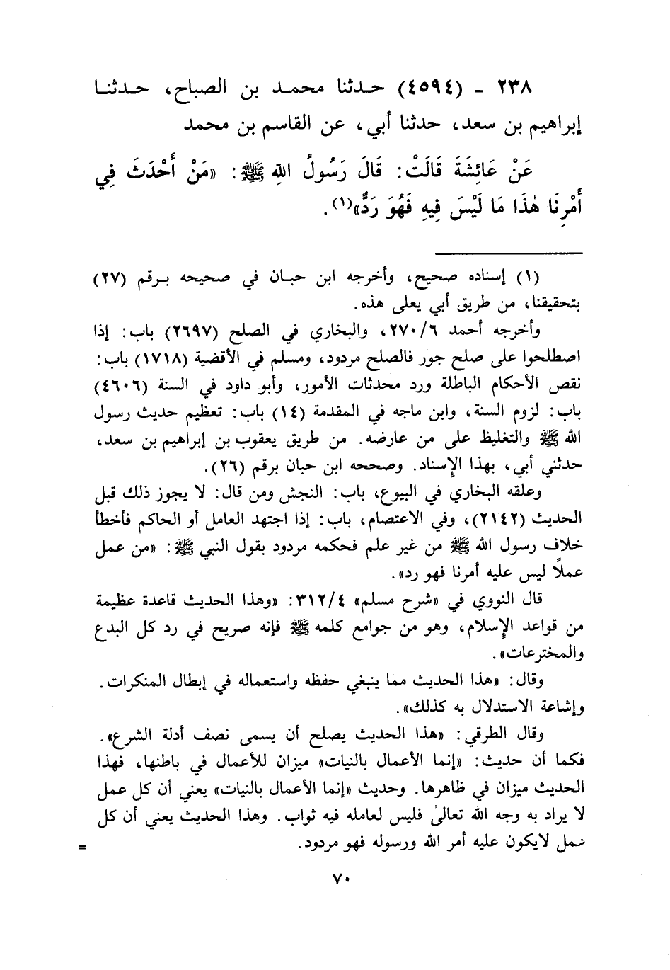 4594 - حَدَّثَنَا مُحَمَّدُ بْنُ الصَّبَّاحِ، حَدَّثَنَا إِبْرَاهِيمُ بْنُ سَعْدٍ، حَدَّثَنَا أَبِي، عَنِ الْقَاسِمِ بْنِ مُحَمَّدٍ، عَنْ عَائِشَةَ قَالَتْ: قَالَ رَسُولُ اللَّهِ صَلَّى اللهُ عَلَيْهِ وَسَلَّمَ: «§مَنْ أَحْدَثَ فِي أَمْرِنَا هَذَا مَا لَيْسَ فِيهِ فَهُوَ رَدٌ» Kإسناده صحيح