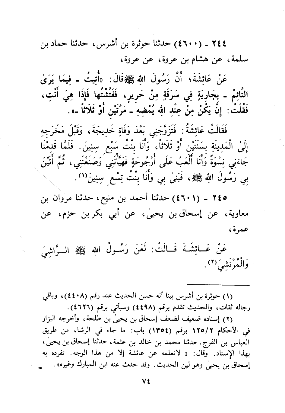 4600 - حَدَّثَنَا حَوْثَرَةُ بْنُ أَشْرَسَ، حَدَّثَنَا حَمَّادُ بْنُ سَلَمَةَ، عَنْ هِشَامِ بْنِ عُرْوَةَ، عَنْ عُرْوَةَ، عَنْ عَائِشَةَ، أَنَّ رَسُولَ اللَّهِ صَلَّى اللهُ عَلَيْهِ وَسَلَّمَ قَالَ: " §أُتِيتُ - فِيمَا يَرَى النَّائِمُ - بِجَارِيَةٍ فِي سَرَقَةٍ مِنْ حَرِيرٍ، فَفَتَّشْتُهَا فَإِذَا هِيَ أَنْتِ فَقُلْتُ: إِنْ يَكُنْ مِنْ عِنْدِ اللَّهِ يُمْضِهِ مَرَّتَيْنِ أَوْ ثَلَاثًا " فَقَالَتْ عَائِشَةُ: فَتَزَوَّجَنِي بَعْدَ وَفَاةِ خَدِيجَةَ وَقَبْلَ مَخْرَجِهِ إِلَى الْمَدِينَةِ بِسَنَتَيْنِ أَوْ ثَلَاثًا وَأَنَا بِنْتُ سَبْعِ سِنِينَ، فَلَمَّا قَدِمْنَا جَاءَنِي نِسْوَةٌ وَأَنَا أَلْعَبُ عَلَى أُرْجُوحَةٍ فَهَيَّأْنَنِي وَصَنَعْنَنِي، ثُمَّ أَتَيْنَ بِي رَسُولَ اللَّهِ صَلَّى اللهُ عَلَيْهِ وَسَلَّمَ فَبَنَى بِي وَأَنَا بِنْتُ تِسْعِ سِنِينَ "