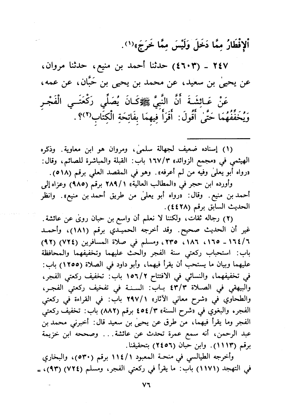 4603 - حَدَّثَنَا أَحْمَدُ بْنُ مَنِيعٍ، حَدَّثَنَا مَرْوَانُ، عَنْ يَحْيَى بْنِ سَعِيدٍ، عَنْ مُحَمَّدِ بْنِ يَحْيَى بْنِ حَبَّانَ، عَنْ عَمِّهِ، عَنْ عَائِشَةَ، أَنَّ النَّبِيَّ صَلَّى اللهُ عَلَيْهِ وَسَلَّمَ " §كَانَ يُصَلِّي رَكْعَتَيِ الْفَجْرِ وَيُخَفِّفُهُمَا حَتَّى أَقُولَ: أَقَرَأَ فِيهِمَا بِفَاتِحَةِ الْكِتَابِ؟ "Kرجاله ثقات