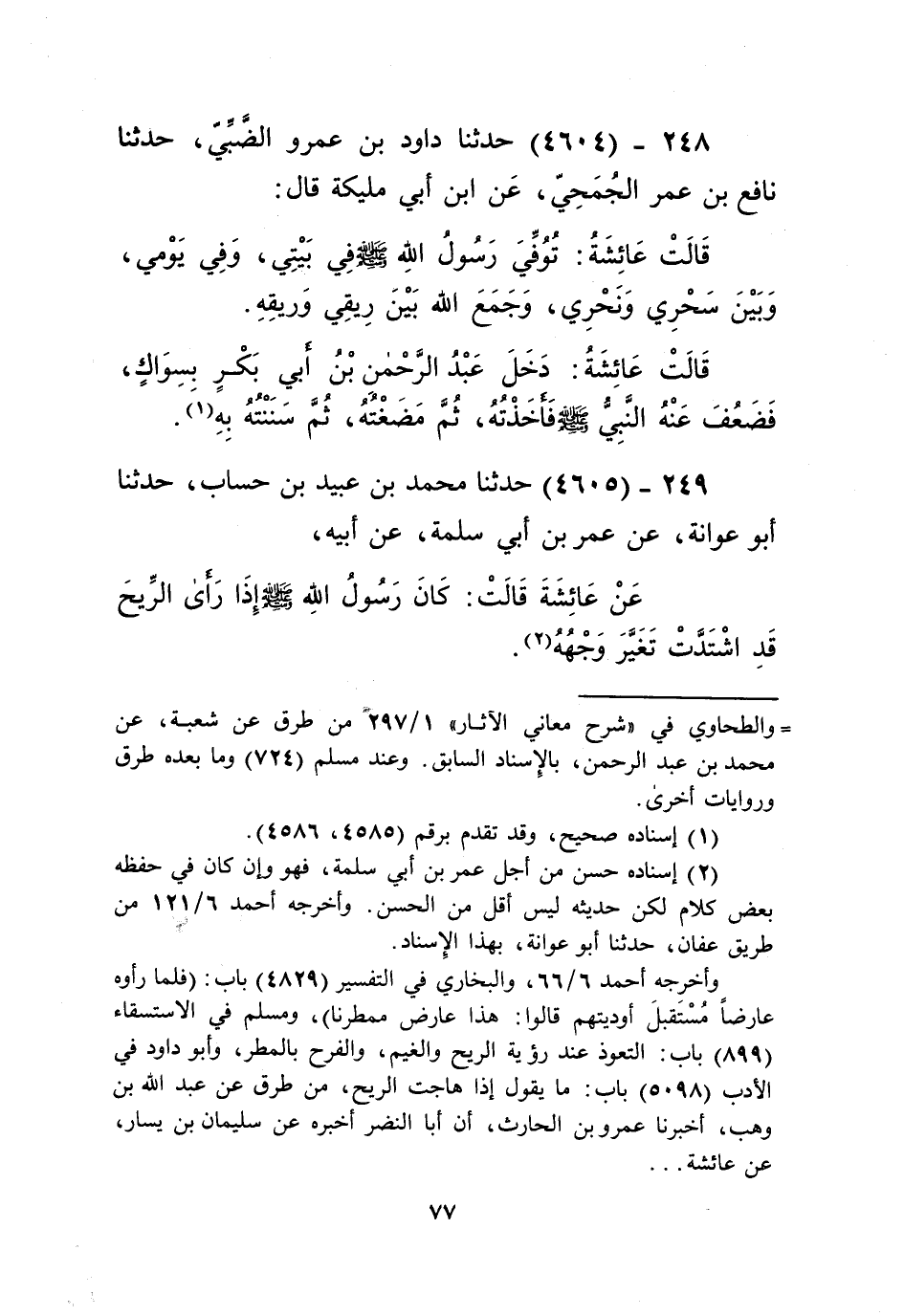 4604 - حَدَّثَنَا دَاوُدُ بْنُ عَمْرٍو الضَّبِّيُّ، حَدَّثَنَا نَافِعُ بْنُ عُمَرَ الْجُمَحِيُّ، عَنِ ابْنِ أَبِي مُلَيْكَةَ قَالَ: قَالَتْ عَائِشَةُ: " §تُوُفِّيَ رَسُولُ اللَّهِ صَلَّى اللهُ عَلَيْهِ وَسَلَّمَ فِي بَيْتِي وَفِي يَوْمِي وَبَيْنَ سَحْرِي وَنَحْرِي، وَجَمَعَ اللَّهُ بَيْنَ رِيقِي وَرِيقِهِ. قَالَتْ عَائِشَةُ: دَخَلَ عَبْدُ الرَّحْمَنِ بْنُ أَبِي بَكْرٍ بِسِوَاكٍ فَضَعُفَ عَنْهُ النَّبِيُّ صَلَّى اللهُ عَلَيْهِ وَسَلَّمَ فَأَخَذْتُهُ ثُمَّ مَضَغْتُهُ ثُمَّ سَنَنْتُهُ بِهِ "Kإسناده صحيح