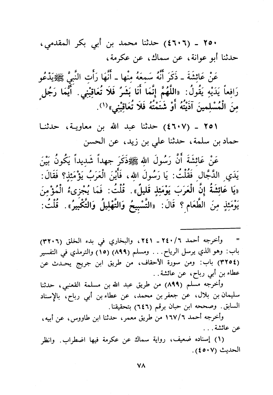 4606 - حَدَّثَنَا مُحَمَّدُ بْنُ أَبِي بَكْرٍ الْمُقَدَّمِيُّ، حَدَّثَنَا أَبُو عَوَانَةَ، عَنْ سِمَاكٍ، عَنْ عِكْرِمَةَ، عَنْ عَائِشَةَ، - ذَكَرَ أَنَّهُ سَمِعَهُ مِنْهَا، - أَنَّهَا رَأَتِ النَّبِيَّ صَلَّى اللهُ عَلَيْهِ وَسَلَّمَ يَدْعُو رَافِعًا يَدَيْهِ يَقُولُ: «§اللَّهُمَّ إِنَّمَا أَنَا بَشَرٌ فَلَا تُعَاقِبْنِي , أَيُّمَا رَجُلٌ مِنَ الْمُسْلِمِينَ آذَيْتُهُ أَوْ شَتَمْتُهُ فَلَا تُعَاقِبْنِي» Kإسناده ضعيف