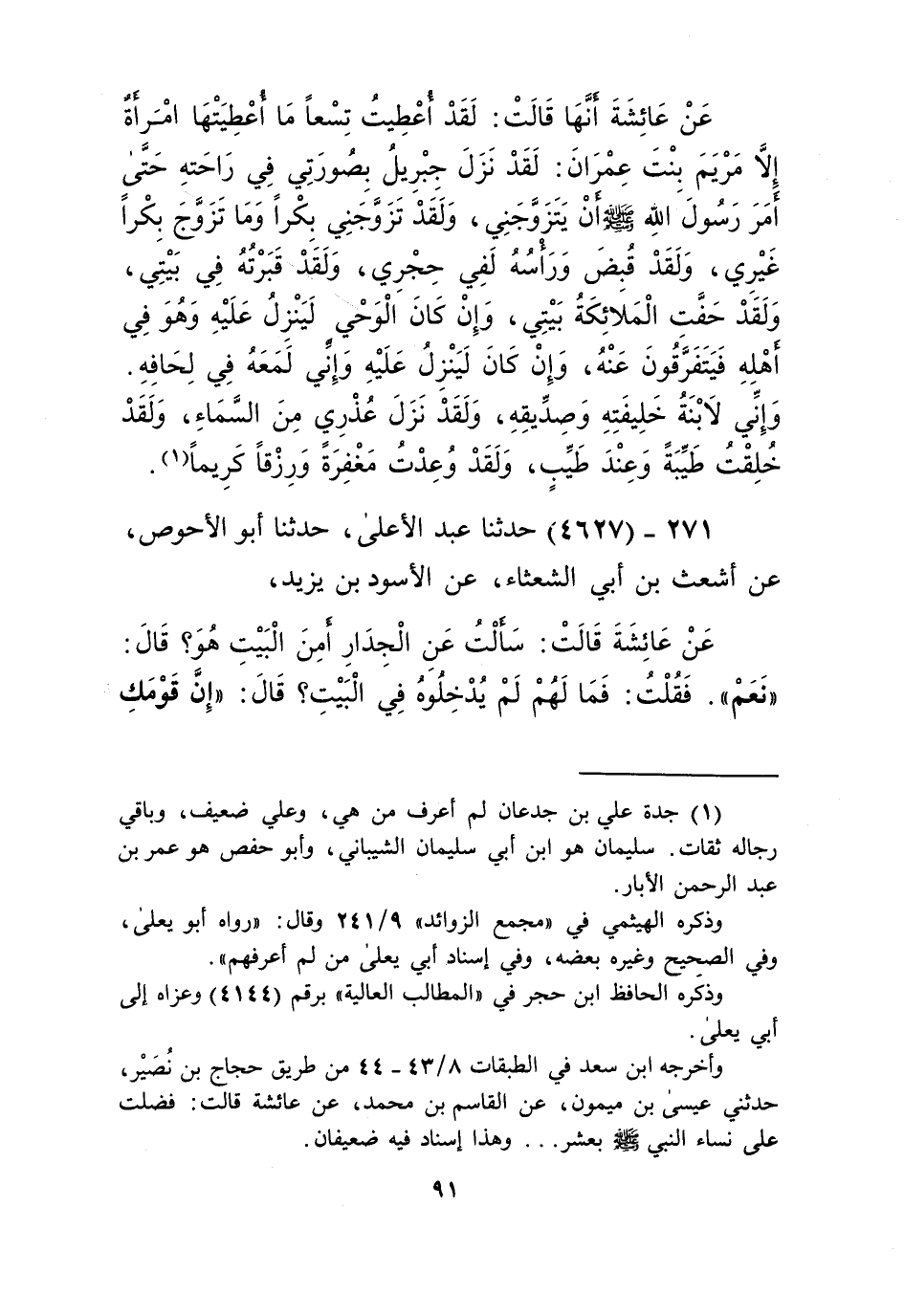 4627 - حَدَّثَنَا عَبْدُ الْأَعْلَى، حَدَّثَنَا أَبُو الْأَحْوَصِ، عَنْ أَشْعَثَ بْنِ أَبِي الشَّعْثَاءِ، عَنِ الْأَسْوَدِ بْنِ يَزِيدَ، عَنْ عَائِشَةَ، قَالَتْ: سَأَلْتُ عَنِ الْجِدَارِ، أَمِنَ الْبَيْتِ هُوَ؟ قَالَ: «نَعَمْ» , فَقُلْتُ: فَمَا لَهُمْ لَمْ يُدْخِلُوهُ فِي الْبَيْتِ؟ قَالَ: «§إِنَّ قَوْمَكِ قَصُرَتْ بِهِمُ النَّفَقَةُ» , قَالَتْ: فَقُلْتُ لَهُ: مَا شَأْنُ بَابِهِ مُرْتَفِعٌ؟ قَالَ: «فَعَلَ ذَلِكَ قَوْمُكِ لِيُدْخِلُوا مَنْ شَاؤُوا , وَلَوْلَا أَنَّ قَوْمَكِ حَدِيثٌ عَهْدُهُمْ بِجَاهِلِيَّةٍ فَأَخَافُ أَنْ تُنْكِرَ قُلُوبُهُمْ لَنَظَرْتُ أَنْ أُدْخِلَ الْحِجْرَ فِي الْبَيْتِ , وَأَنْ أَلْزِقَ بَابَهُ بِالْأَرْضِ» Kإسناده صحيح